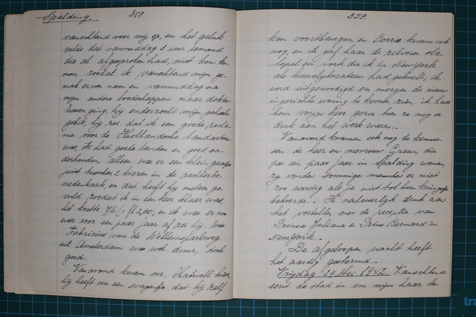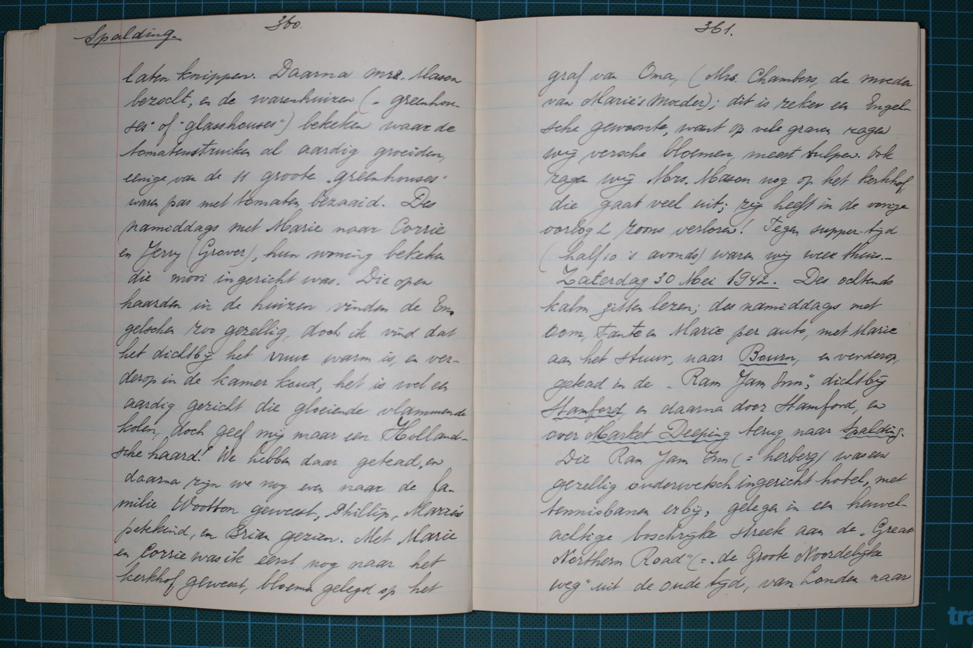 Vrijdag 29 Mei 1942. Vanochtend eerst de stad in om mijn haar te laten knippen. 360 Daarna mrs. Mason bezocht, en de warenhuizen (“greenhouses” of “glasshouses”) bekeken waar de tomatenstruiken al aardig groeiden, eenige van de 11 groote “greenhouses” waren pas met tomaten bezaaid. Des namiddags met marie naar Corrie en Jerry (Grover), hun woning bekeken die mooi ingericht was. Die open haarden in de huizen vinden de Engelschen zoo gezellig, doch ik vind dat het dichtbij het vuur warm is, en verderop in de kamer koud, het is wel een aardig gezicht die gloeiende vlammende kolen, doch geef mij maar een Hollandsche haard! We hebben daar getead, en daarna zijn we nog even naar de familie Wootton geweest, Phillip, Marie’s petekind, en Brian gezien.