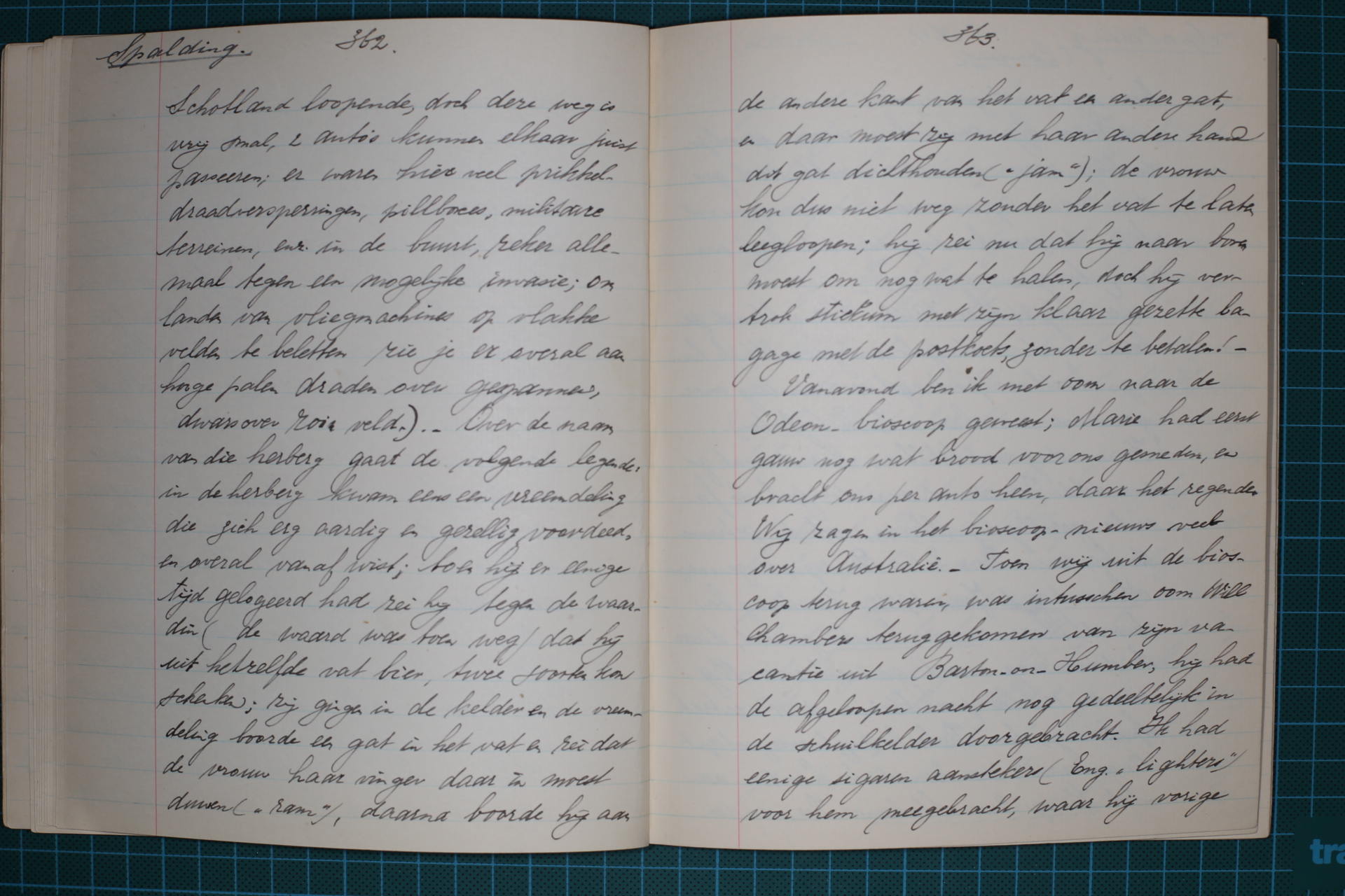 Vanavond ben ik met oom naar de Odeon-bioscoop geweest; Marie had eerst gauw nog wat brood voor ons gesneden, en bracht ons per auto heen, daar het regende. Wij zagen in het bioscoop-nieuws veel over Australië. Toen wij uit de bioscoop terug waren, was intusschen oom Will Chambers teruggekomen van zijn vacantie uit Barton-on-Humber, hij had de afgeloopen nacht nog gedeeltelijk in de schuilkelder doorgebracht. Ik had eenige sigaren aanstekers (Eng. “lighters”) voor hem meegebracht, waar hij vorige keer om verlegen was.-