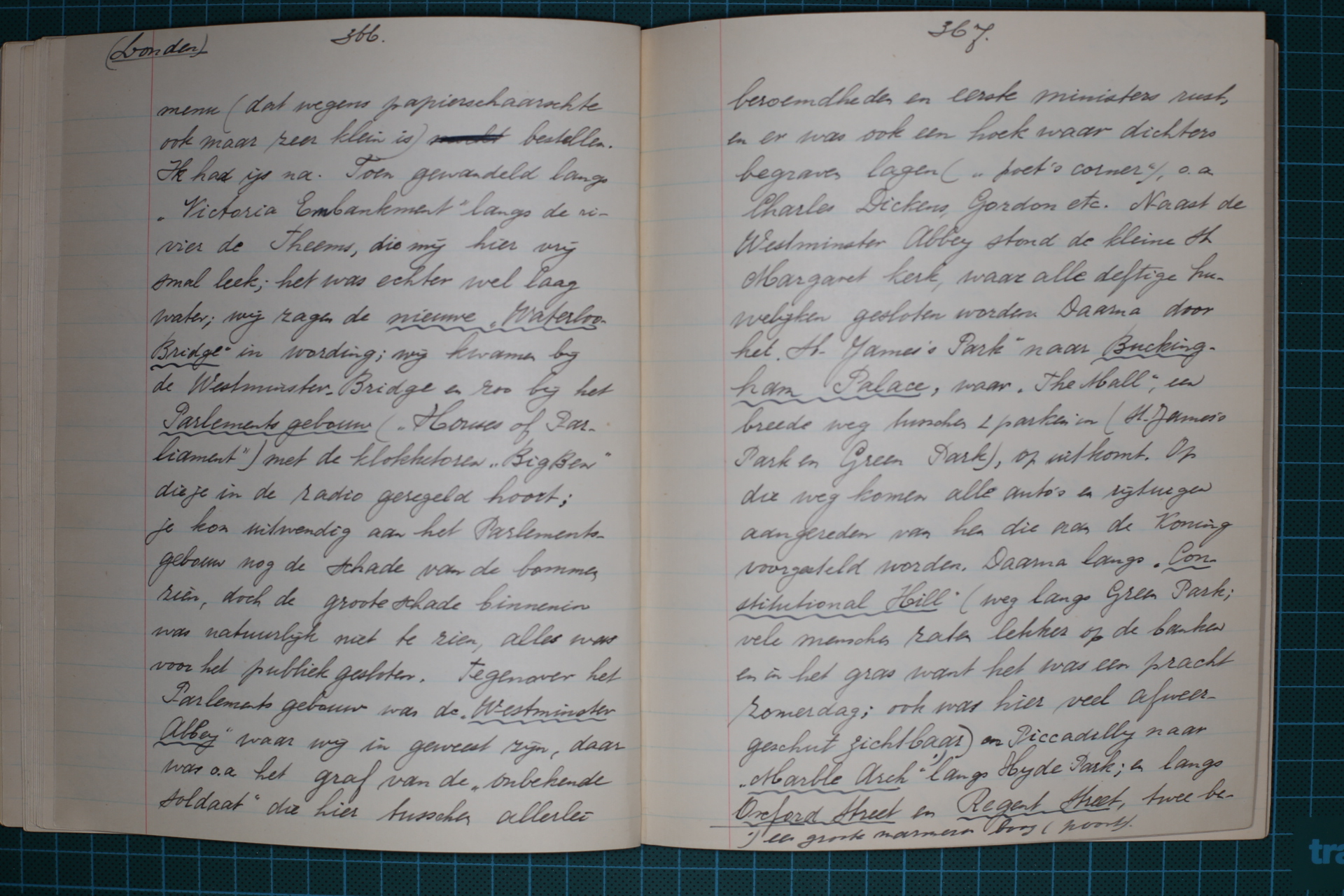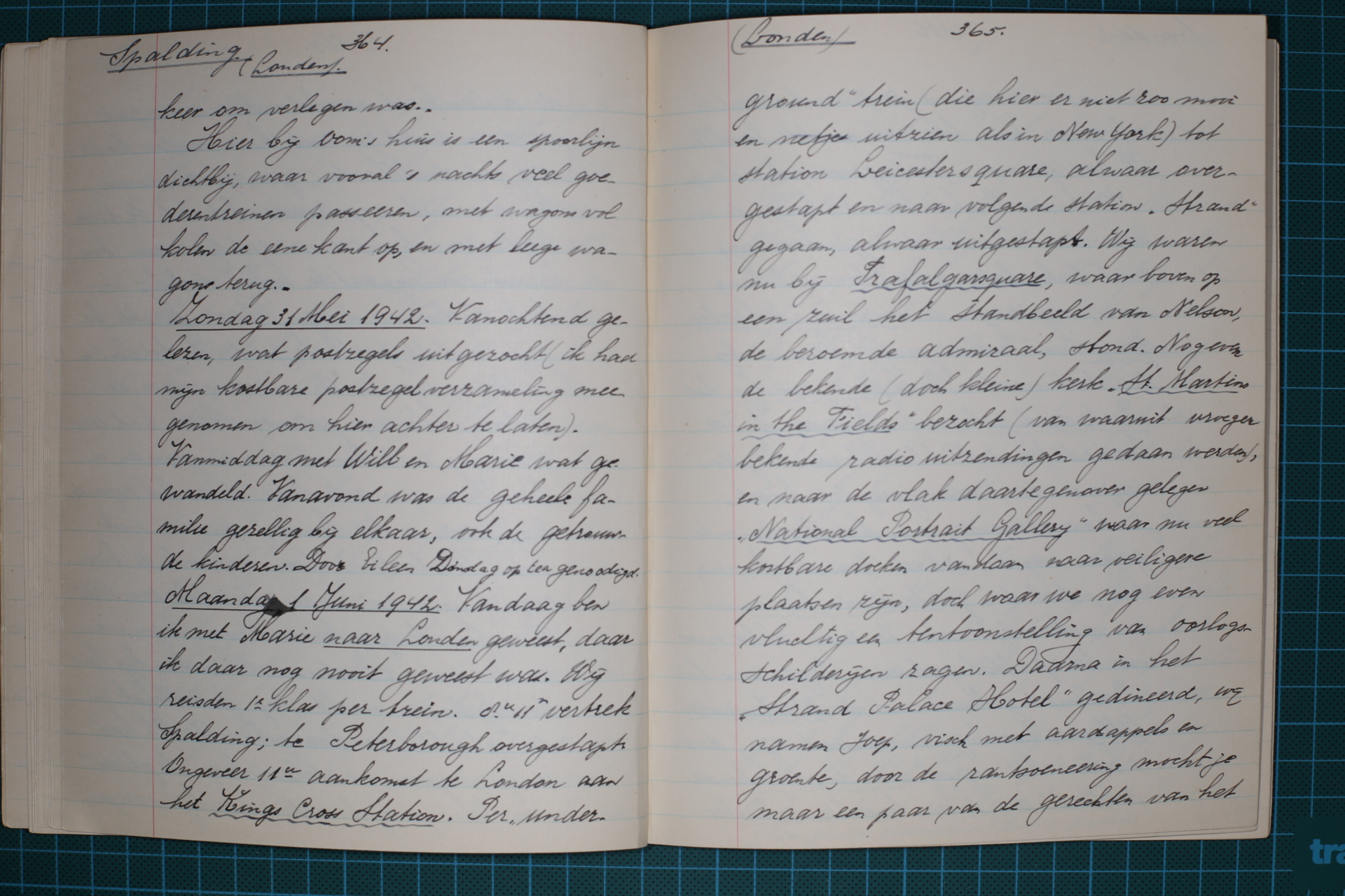 Maandag 1 Juni 1942. Vandaag ben ik met Marie naar Londen geweest, daar ik daar nog nooit geweest was. Wij reisden 1e klas per trein. 8u11m vertrek Spalding; te Petersborough overgestapt. Ongeveer 11u aankomst te London aan het Kings Cross 365 Station. Per “underground” trein (die hier er niet zoo mooi en netjes uitzien als in New York) tot station Leicestersquare, alwaar overgestapt en naar volgende station “Strand” gegaan, alwaar uitgestapt.