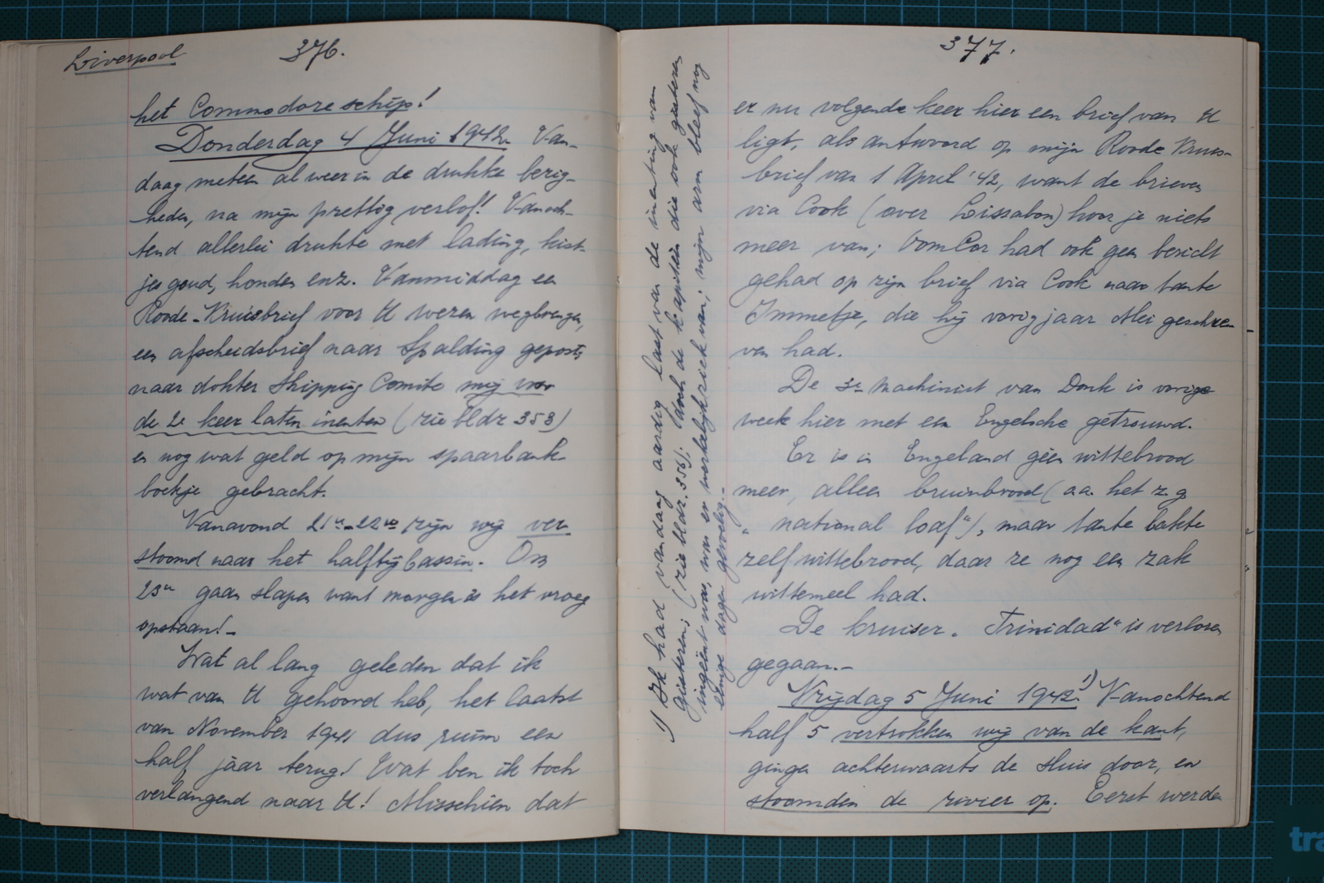 Donderdag 4 Juni 1942. Vandaag meteen al weer in de drukke bezigheden, na mijn prettig verlof! Vanochtend allerlei drukte met lading, kistjes goud, honden enz. Vanmiddag een Roode Kruisbrief voor U wezen wegbrengen, een afscheidsbrief naar Spalding gepost, naar dokter Shipping Comite mij voor de 2e keer laten inenten (zie bldz 358) en nog wat geld op mijn spaarbankboekje gebracht.