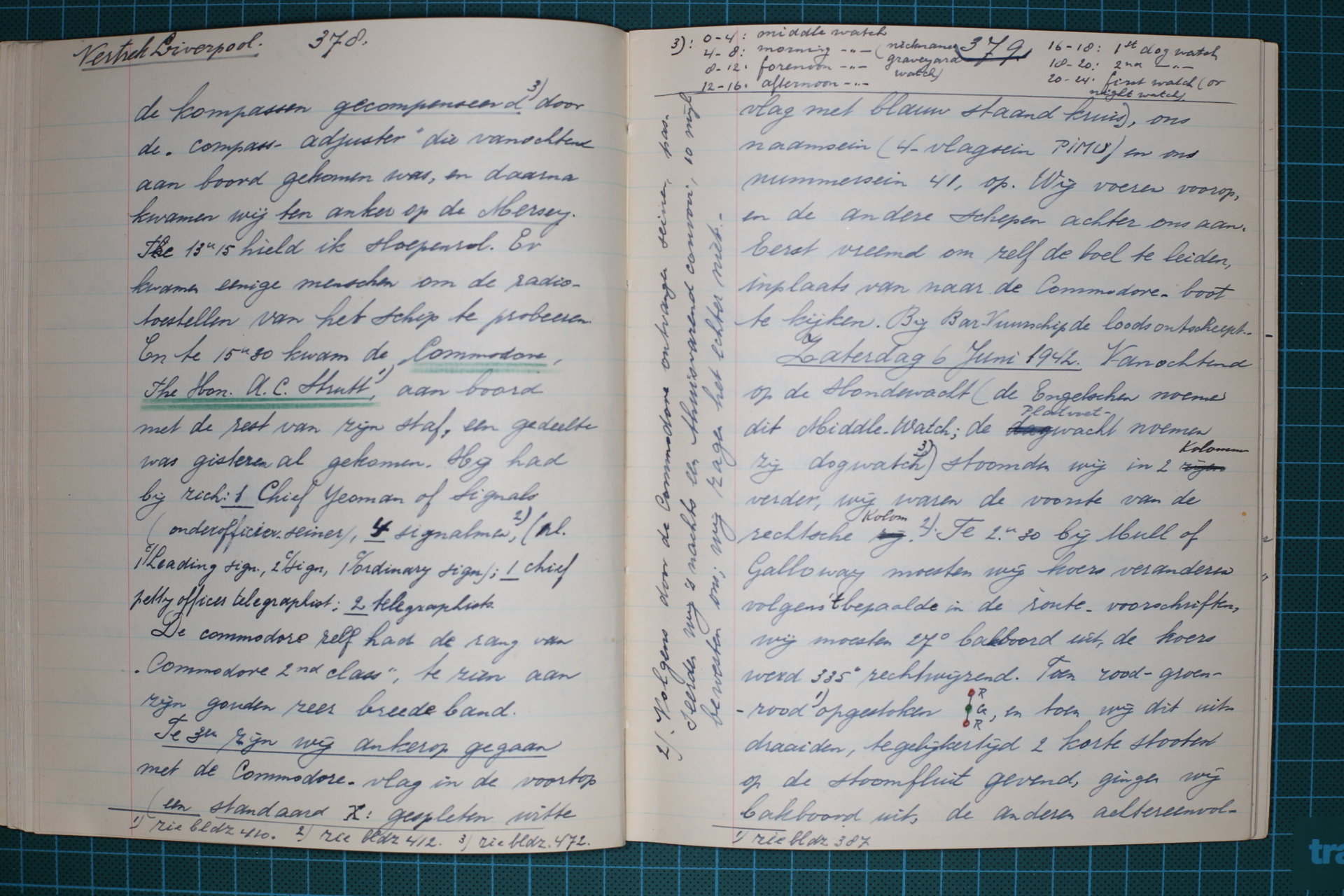 Vrijdag 5 Juni 1942. [1] Vanochtend half 5 vertrokken wij van de kant, gingen achterwaarts de sluis door, en stoomden de rivier op. Eerst werden de kompassen 378 gecompenseerd [2] door de “compass-adjuster” die vanochtend aan boord gekomen was, en daarna kwamen wij ten anker op de Mersey. Te 13u15 hield ik sloepenrol. Er kwamen eenige menschen om de radiotoestellen van het schip te probeeren. En te 15u30 kwam de Commodore, the Hon. A.C. Strutt, [3] aan boord met de rest van zijn staf, een gedeelte was gisteren al gekomen. Hij had bij zich: 1 Chief Yeoman of Signals (onderofficier-seiner), 4 signalmen, [4] (nl. 1c/Leading sign., 2c/sign., 1c/ordinary sign.); 1 chief petty officer telegraphist; 2 telegraphists.