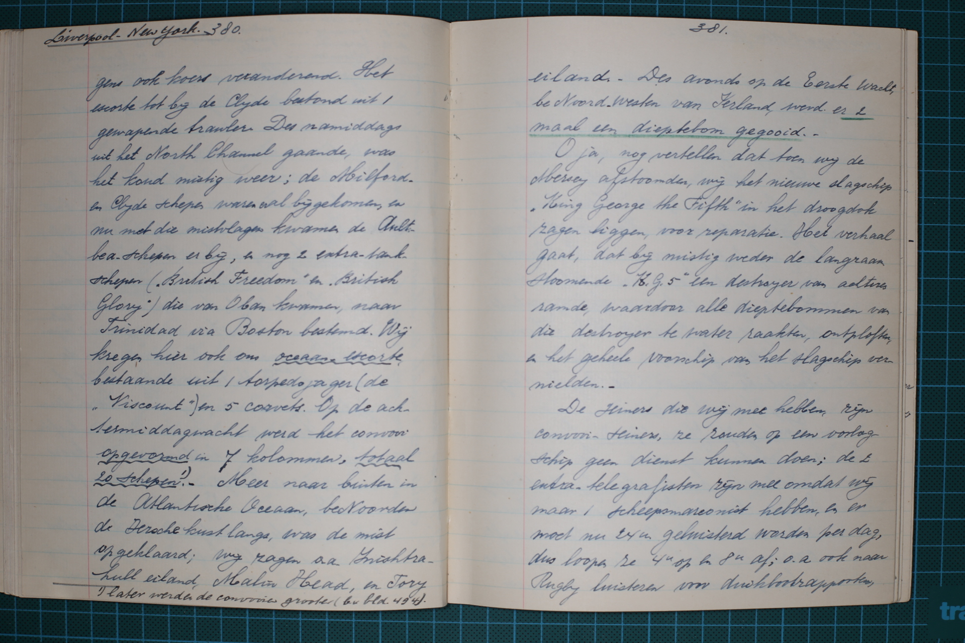 Zaterdag 6 Juni 1942. Vanochtend op de hondewacht (de Engelschen noemen dit Middle-Watch; de Platvoet-wacht noemen zij dog watch) [5] stoomden wij in 2 kolommen verder, wij waren de voorste van de rechtsche kolom. [6] Te 2.u30 bij Mull of Galloway moesten wij koers veranderen volgens ’t bepaalde in de route-voorschriften, wij moesten 27° bakboord uit, de koers werd 335° rechtwijzend. Toen rood-groen-rood [7] opgestoken (volgt tekening/ zie bladzijde 379 uit schrift), en toen wij dit uitdraaiden, tegelijkertijd 2 korte stooten op de stoomfluit gevend, gingen wij 380 bakboord uit, de anderen achtereenvolgens ook koers veranderend.
