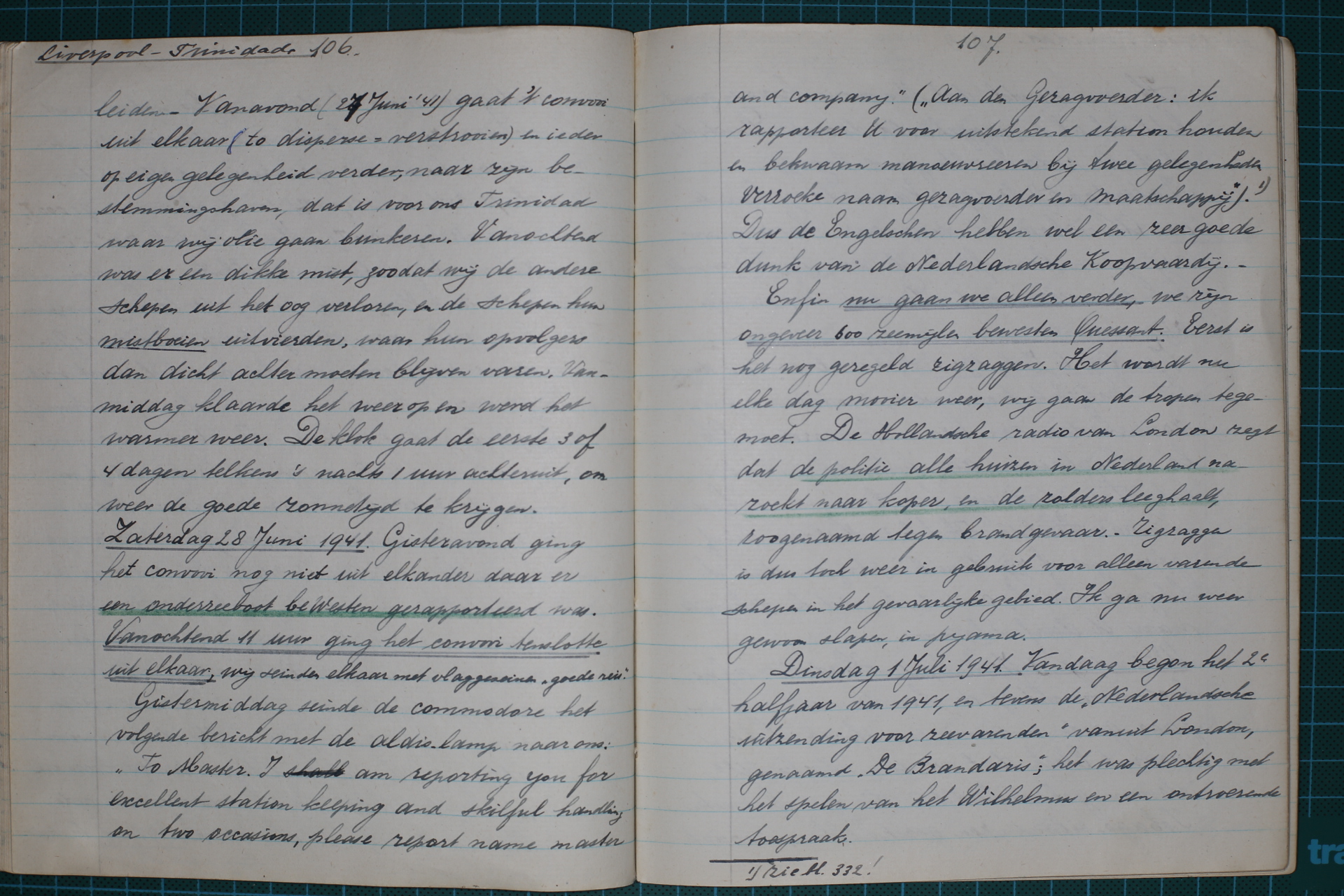 Dinsdag 1 Juli 1941. Vandaag begon het 2e halfjaar van 1941, en tevens de “Nederlandsche uitzending voor zeevarenden” vanuit London, genaamd “de Brandaris”; het was plechtig met het spelen van het Wilhelmus en een ontroerende 108 toespraak. Ik veronderstel dat Uw mooie koperen waschketel ook al is weggehaald door de Duitschers als ik de radioberichten goed begrijp.