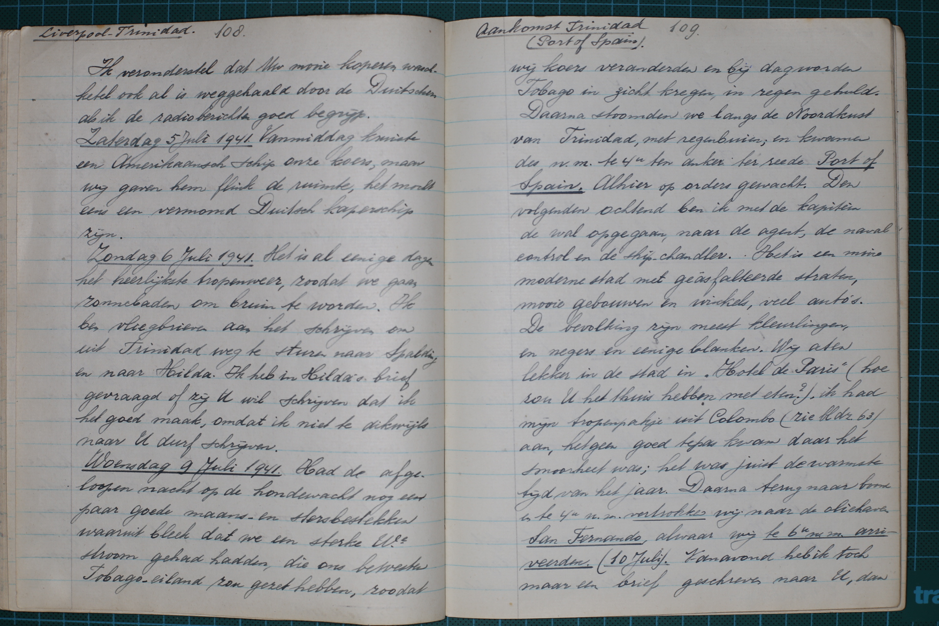 Woensdag 9 juli 1941 Ik had de afgelopen nacht op de hondenwacht nog een paar goede maans- en stersbestekken. Daaruit bleek dat we een sterke westelijke stroom hadden gehad die ons ten westen van Tobago zou hebben gezet. We veranderden koers en toen het dag werd, kregen we een in regen gehuld Tobago in zicht. We stoomden vervolgens, in regenbuien, langs de noordkust van Trinidad en lagen om vier uur ’s middags voor anker voor de rede van Port of Spain. Daar hebben we op orders gewacht.