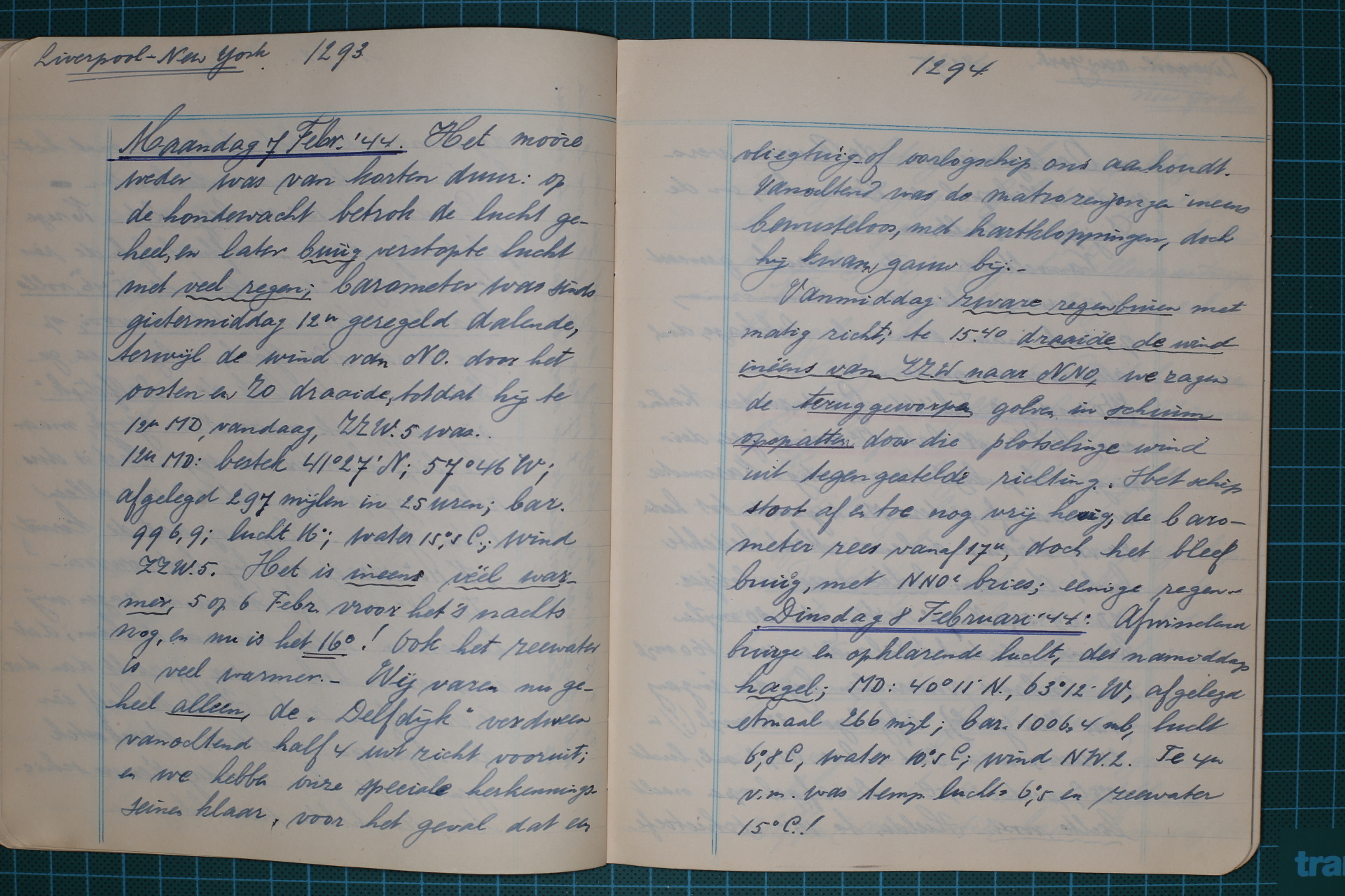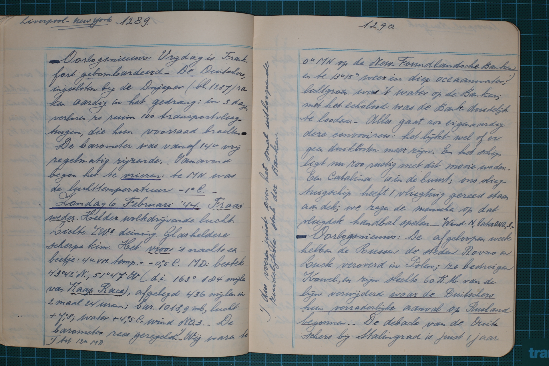 Zondag 6 Februari ’44. Fraai weder. Heldere wolkdrijvende lucht. Lichte ZWe deining. Glasheldere scherpe kim. Het vroor ’s nachts een beetje: 4 uur v.m. temp. = -0,5° C. MD.: bestek: 43° 42’ N., 51° 47’ W. (d.i. 163° 184 mijlen van Kaap Race), afgelegd 436 mijlen in 2 maal 24 uren; bar. 1018,9 mb., lucht +7,8°; water +4,5° C., wind NO. 3.- De barometer rees geregeld [1].-