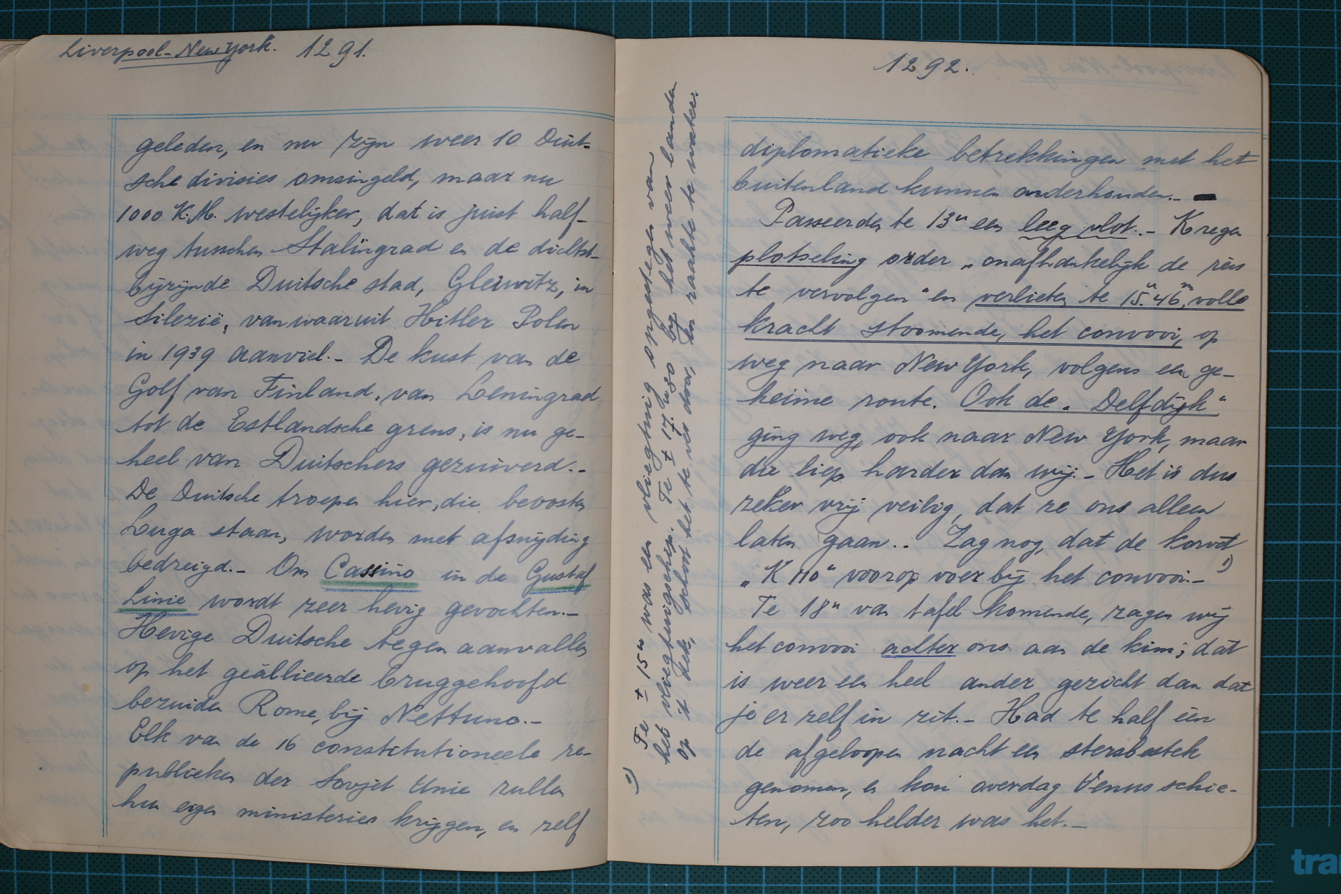 Wij waren te 0 uur MN. op de New-Foundlandsche Banken 1290 en te 13.15 uur weer in diep oceaanwater [2]; lichtgroen was ’t water op de Banken; met het echolood was de Bank duidelijk te looden.- Alles gaat zoo eigenaardig deze convooireis: het lijkt wel of er geen duikbooten meer zijn. En het schip ligt nu zoo rustig met dit mooie weder.- Een Catalina is in de buurt; ons vliegtuigschip heeft 1 vliegtuig gereed staan aan dek; we zagen de menschen op dat vliegdek handbal spelen.- Wind: N., later ONO. 3.-