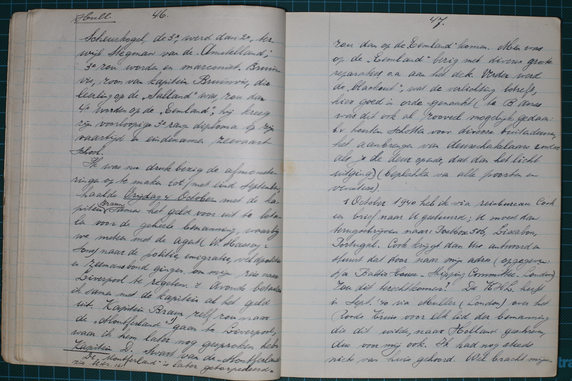 Ik was nu druk bezig de afmonsteringen op te maken tot/met eind September, haalde Vrijdag 4 October met de kapitein Braun samen het geld voor uit te betalen voor de geheele bemanning, waarbij we meteen met de agent (W. Massey & Sons) naar de politie, emigratie, veldpolitie en zeemansbond gingen om mijn reis naar Liverpool te regelen. ’s Avonds betaalde ik samen met de kapitein al het geld uit. Kapitein Braun zelf zou naar de “Montferland” [1] gaan te Liverpool, waar ik hem later nog gesproken heb. Kapitein d. Swart van de "Montferland" zou dan op de "Eemland" komen. Men was op de "Eemland" bezig met diverse groote reparaties, o.a. aan het dek. Verder werd de 'blackout', wat de verlichting betreft, hier goed in orde gemaakt (te B. Aires was ditook al zooveel mogelijk gedaan: b.v houten schotten voor diverse buitendeuren, het aanbrengen van deurschakelaars zoodat als je de deur opende, dat dan het licht uitging.) (beplakken van alle poorten en vensters).