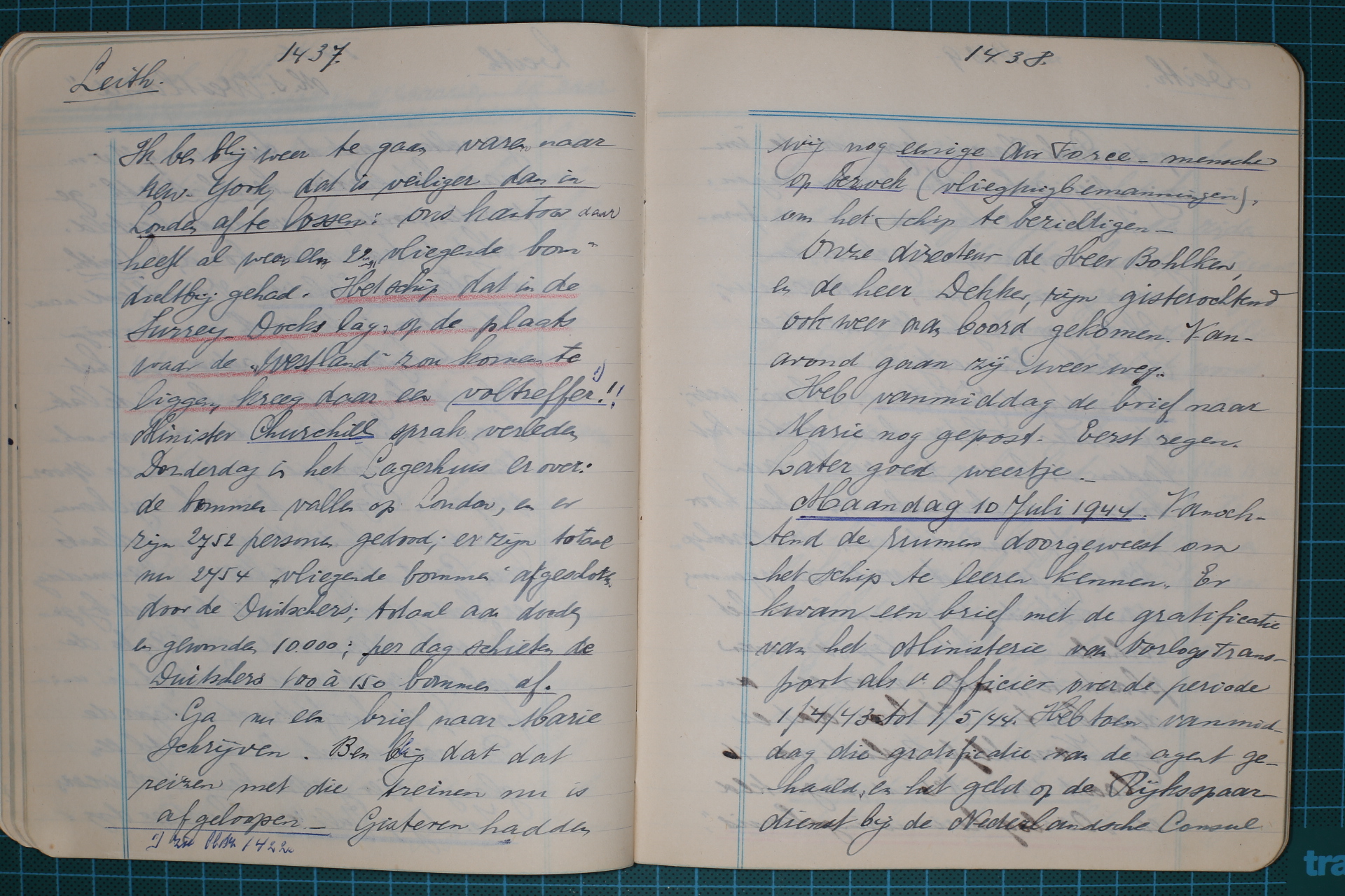 1437 Zondag 9 Juli ’44. Rustige dag. Ik ben blij weer te gaan varen naar New-York, dat is veiliger dan in Londen af te lossen: ons kantoor daar heeft al weer een 2e “vliegende bom” dichtbij gehad. Het schip dat in de Surrey-Docks lag, op de plaats waar de “Westland” zou komen te liggen, kreeg daar een voltreffer [1]!! Minister Churchill sprak verleden Donderdag in het Lagerhuis er over: de bommen vallen op London, en er zijn 2752 personen gedood; er zijn totaal 2754 “vliegende bommen” afgeschoten door de Duitschers; totaal aan dooden en gewonden 10.000; per dag schieten de Duitschers 100 à 150 bommen af.