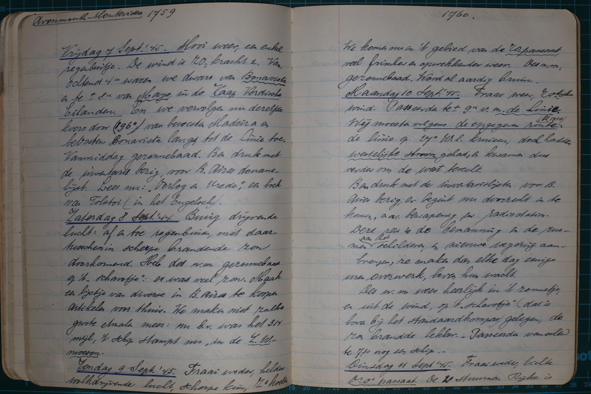 Maandag 10 Sept. ’45. Fraai weer, ZOlijke wind. Passeerden te ± 9 uur v.m. de Linie. Wij moesten volgens de opgegeven route (bl. 1756) de linie op 27° kruisen, doch hadden westelijke stroom gehad, en kwamen dus verder om de west terecht. Ben druk met de inventarislijsten voor B. Aires bezig, er begint nu doorzicht in te komen, o.a. bewapening, en radiostation. Deze reis is de bemanning in de ruimen aan het schilderen, en nieuwe wegering aanbrengen, ze maken dan elke dag eenige uren overwerk, boven hun wacht. Des n.m. weer heerlijk in ’t zonnetje, en uit de wind, op ’t “schavotje” (dat is boven bij het standaardkompas) gelegen, de zon brandde lekker.- Passeerden vanochtend te 7.30 nog een schip.-