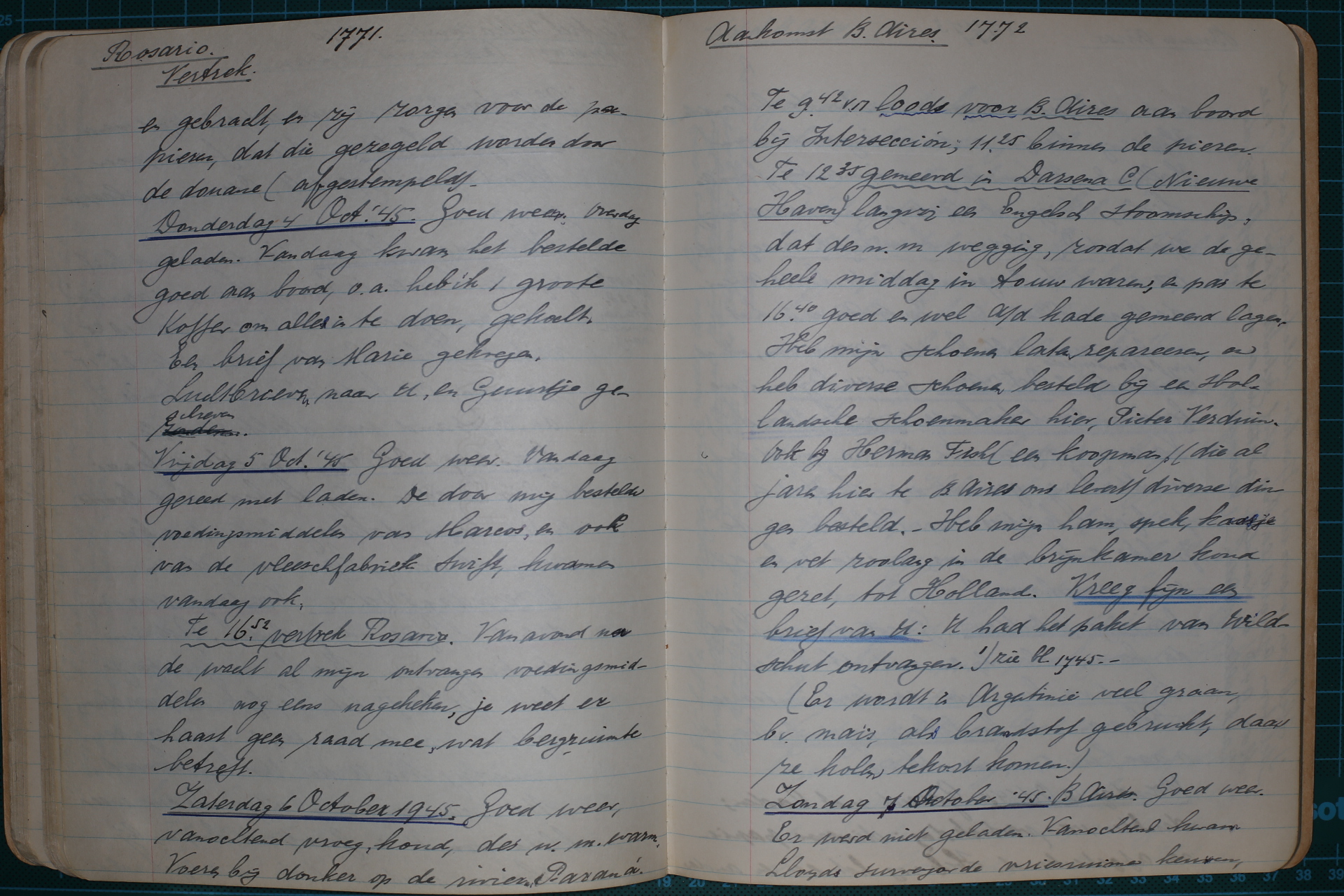 Vrijdag 5 oktober 1945 Goed weer. Vandaag gereed met laden. De door mij bij Marcos en bij vleesfabriek Swift bestelde etenswaren kwamen vandaag aan. Om 16.52 uur vertrokken we uit Rosario. Vanavond na de wacht alle waren nog eens nagelopen. Je weet er, wat bergruimte betreft, haast geen raad mee.