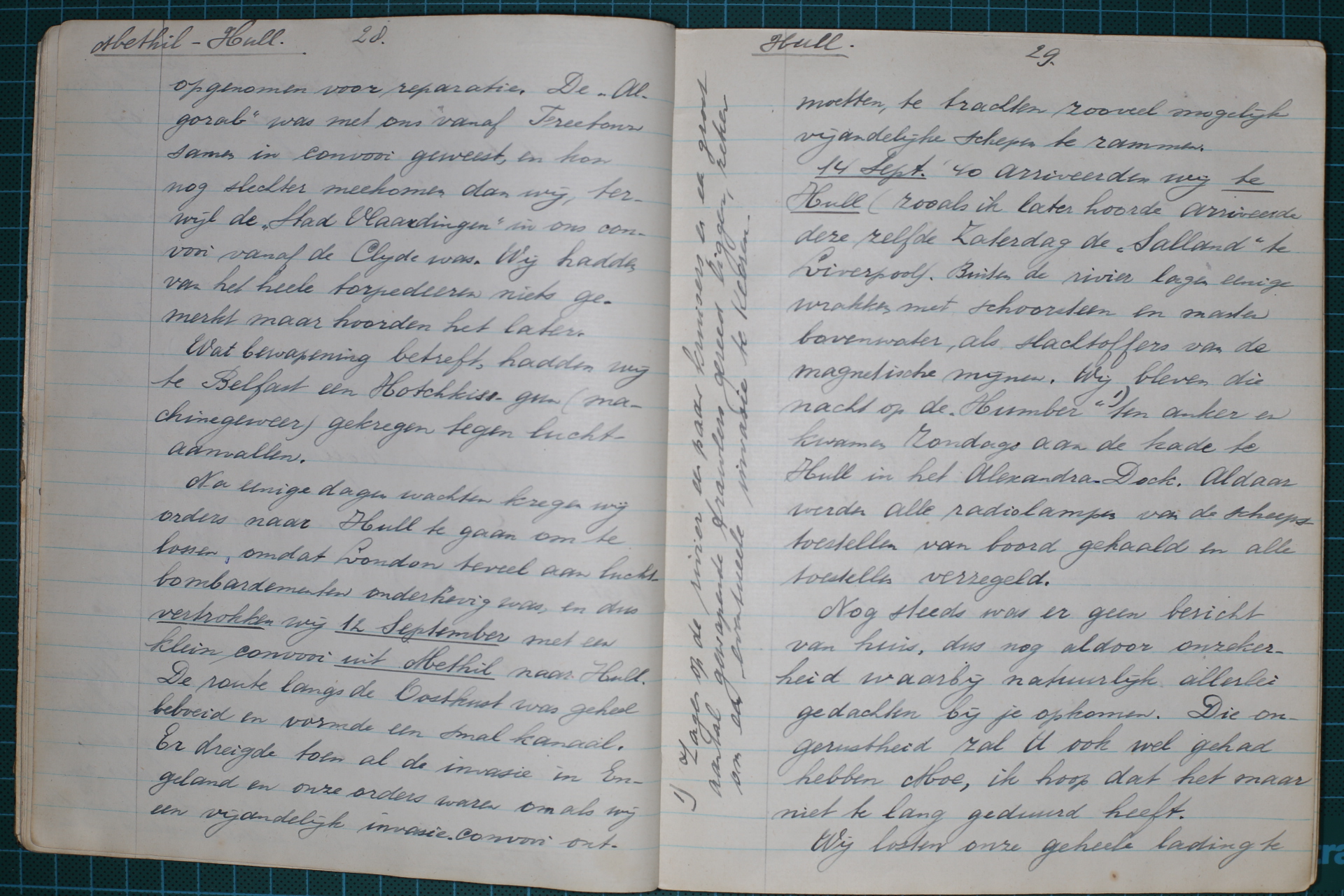 14 Sept.’40 arriveerden wij te Hull (zooals ik later hoorde arriveerde deze zelfde Zaterdag de ”Salland” te Liverpool). Buiten de rivier lagen eenige wrakken met schoorsteen en masten bovenwater, als slachtoffers van de magnetische mijnen. Wij bleven die nacht op de “Humber”, [1] ten anker en kwamen Zondags aan de kade te Hull in het Alexandra-Dock. Aldaar werden alle radiolampen van de scheepstoestellen van boord gehaald en alle toestellen verzegeld. Nog steeds was er geen bericht van huis, dus nog aldoor onzekerheid waarbij natuurlijk allerlei gedachten bij je opkomen. Die ongerustheid zal U ook wel gehad hebben Moe, ik hoop dat het maar niet te lang geduurd heeft.