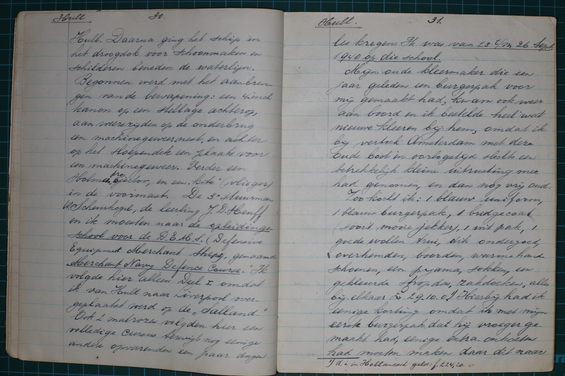 Mijn oude kleermaker die een jaar geleden een pak voor me had gemaakt, kwam aan boord en ik bestelde heel wat nieuwe kleren bij hem. Dit omdat ik bij vertrek uit Amsterdam op deze oude boot maar een betrekkelijk kleine uitrusting had meegenomen en dan ook nog vrij oud. Ik kocht een blauw uniform, een blauw pak, een bridgecoat - dat is een soort jek - een wit pak, een wollen trui, dik ondergoed, overhemden, boorden, warme handschoenen, een pyjama, sokken, een gekleurde stropdas en zakdoeken. Alles bij elkaar kostte het 29.10.0 pond ofwel 224,20 gulden. En dan kreeg ik nog wat korting omdat ik bij het pak dat hij eerder voor me gemaakt had, wat extra onkosten had moeten maken omdat het naar Rotterdam moest worden nagestuurd. We hebben het toen nog samen opgehaald, weet u nog wel? En dan te bedenken dat al die mooie gebouwen die we daar toen hebben gezien door de Duitsers zijn vernield.