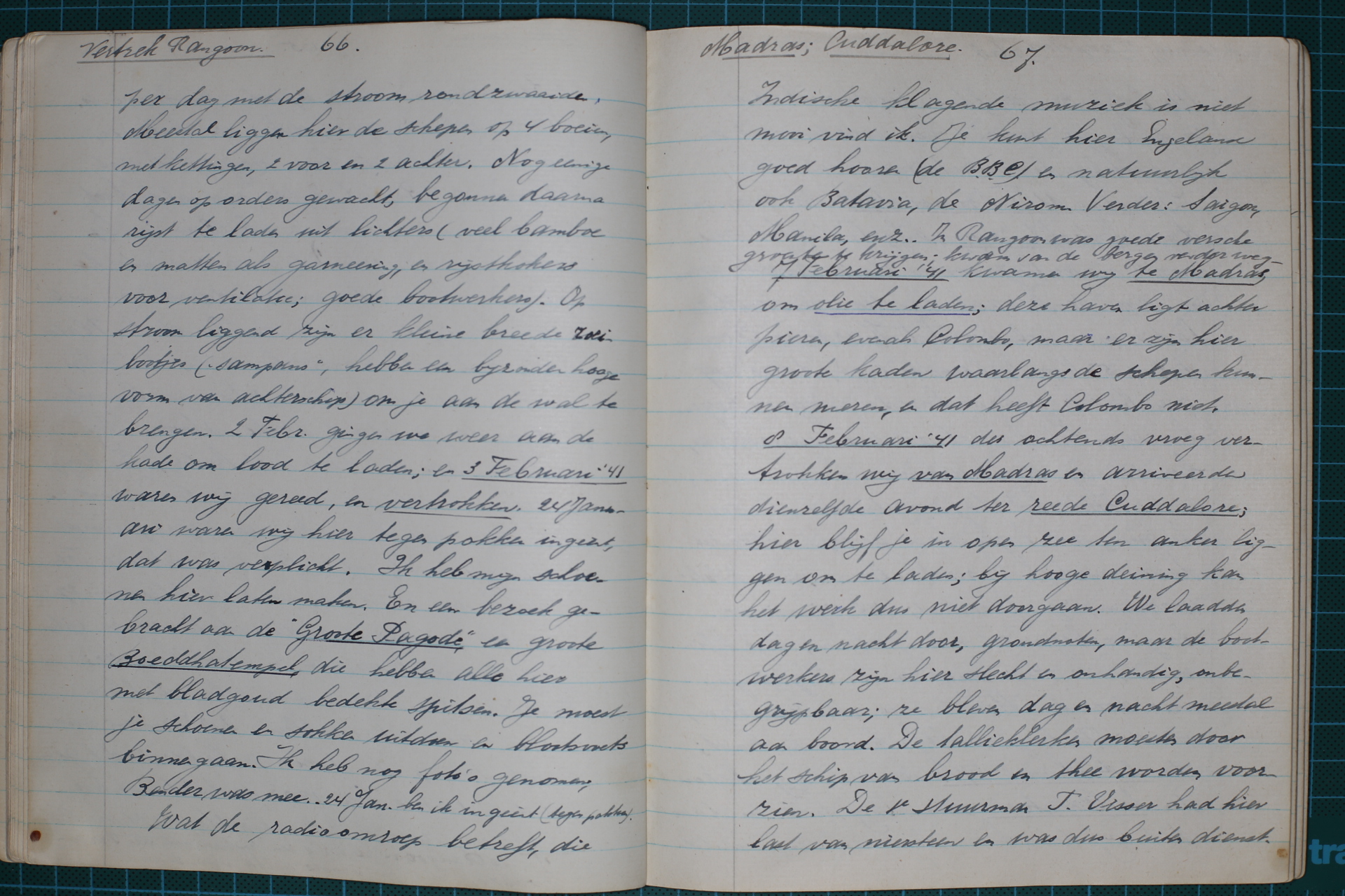 Donderdag 23 januari 1941 Aankomst in Rangoon. Dat ligt in Birma (tegenwoordig Myanmar) en maakt geen deel uit van Brits-Indië. Dat geldt ook voor Ceylon. Het is een kolonie en uit de kranten begreep ik dat Ceylon en Brits-Indië niet al te best met elkaar omgaan, net als Birma trouwens. Op de rivier de Rangoon liep een heel sterke stroom, het water was modderbruin, veel modderiger nog dan de Rio de la Plata. Het schip leek onder water wel schoongeschuurd door de modder en de sterke stroom.