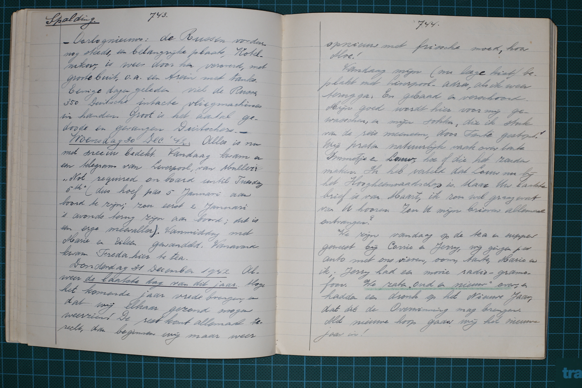 743 --- Oorlogsnieuws: De Russen vorderen nog steeds, een belangrijke plaats, Kotelnikov, is weer door hen veroverd, met groote buit, o.a. een trein met tanks. Eenige dagen geleden viel de Russen 350 Duitsche intacte vliegmachines in handen. Groot is het aantal gedoode en gevangen Duitschers.---