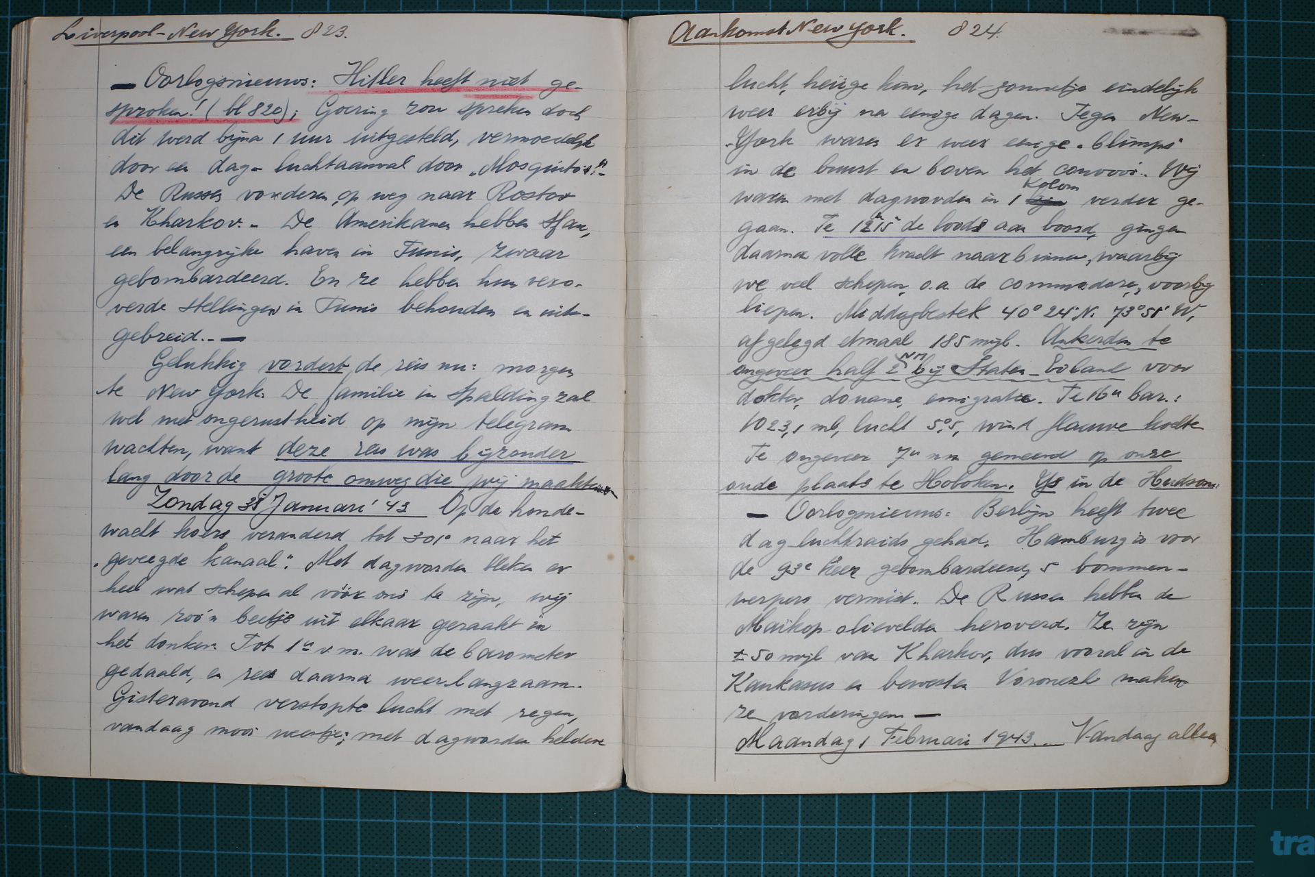 Zondag 31 Januari ’43. Op de hondewacht koers veranderd tot 301° naar het "geveegde kanaal". Met dag worden bleken er heel wat schepen al vóór ons te zijn, wij waren zoo’n beetje uit elkaar geraakt in het donker.