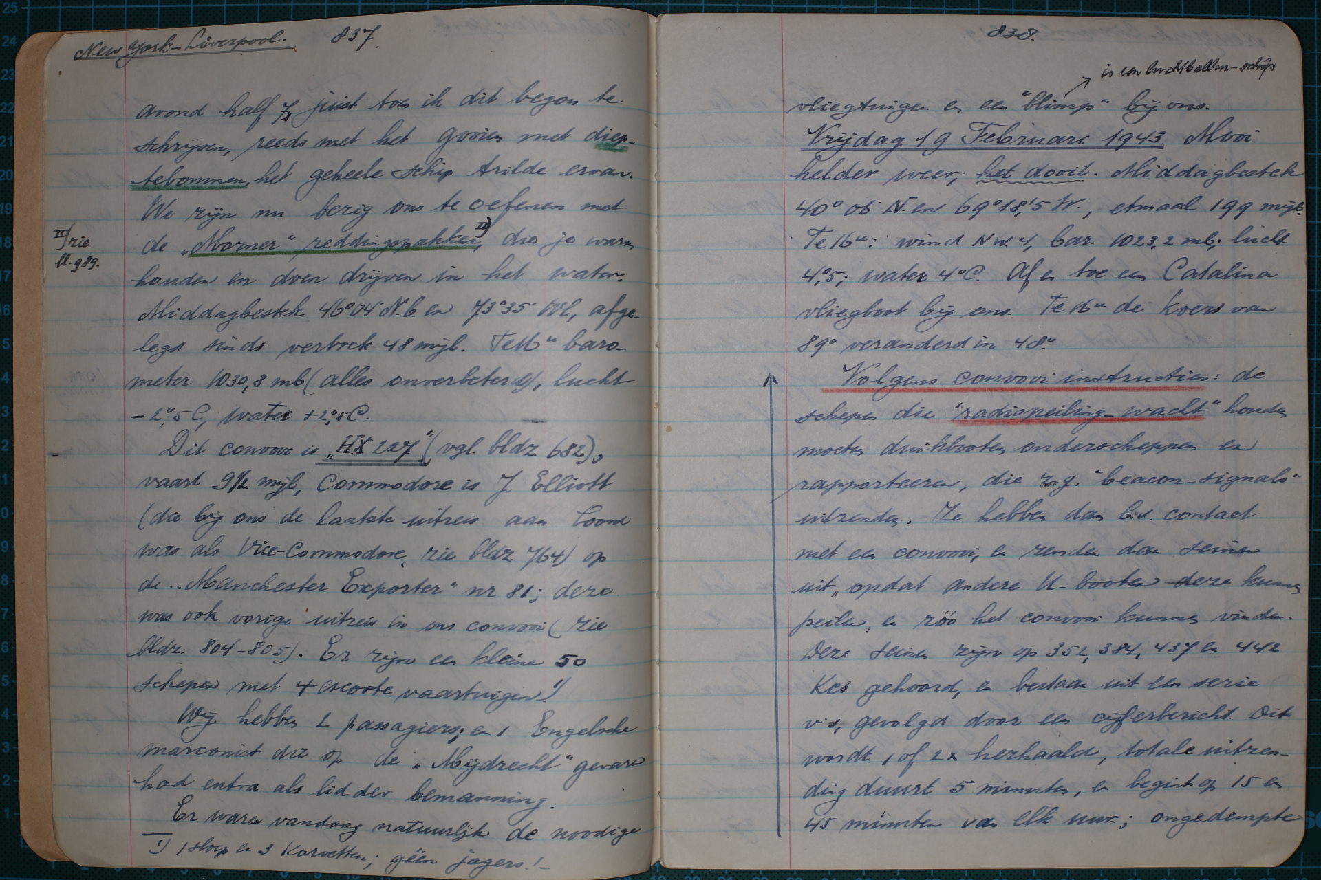 Dit convooi is “HX 227” (vgl. bldz. 682), vaart 9½ mijl, Commodore is J. Elliot (die bij onze laatste uitreis aan boord was als Vice-Commodore, zie bldz. 764) op de “Manchester Exporter” nr. 81; deze was ook vorige uitreis in ons convooi (zie bldz. 804-805). Er zijn een kleine 50 schepen met 4 escorte vaartuigen. [2] Wij hebben 2 passagiers; en 1 Engelsche marconist die op de “Mijdrecht” gevaren had extra als lid der bemanning. 838 Er waren vandaag natuurlijk de noodige vliegtuigen en een “blimp” (is een lichtballon-schip) bij ons.