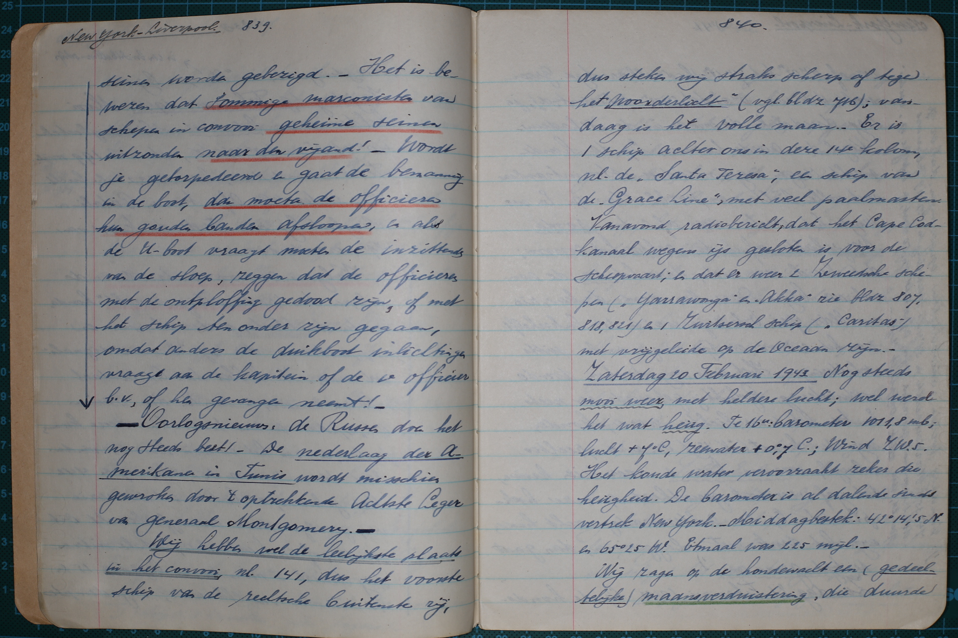 Vrijdag 19 Februari 1943. Mooi helder weer; het dooit. Middagbestek: 40° 06’ Nb. en 69° 18,5’ W., etmaal 199 mijl. Te 16 uur: wind NW. 4., bar. 1023,2 mb.; lucht 4,5°; water 4° C. Af en toe een Catalina vliegboot bij ons. Te 16 uur de koers van 89° veranderd in 48°.