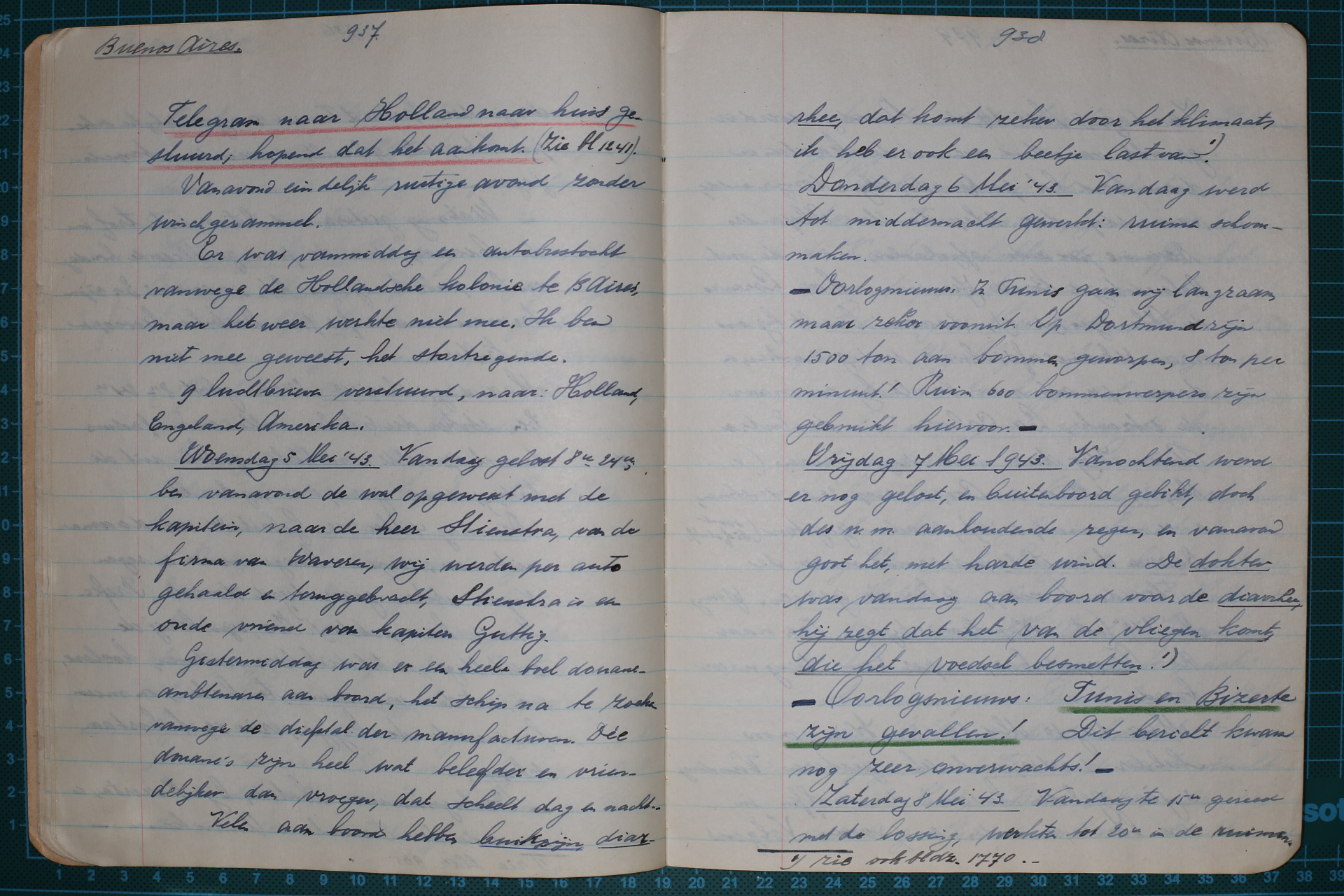 Woensdag 5 Mei ’43. Vandaag gelost 8 uur-24 uur, ben vanavond de wal op geweest met de kapitein, naar de heer Slienstra, van de firma van Waveren, wij werden per auto gehaald en teruggebracht, Slienstra is een oude vriend van kapitein Guttig.