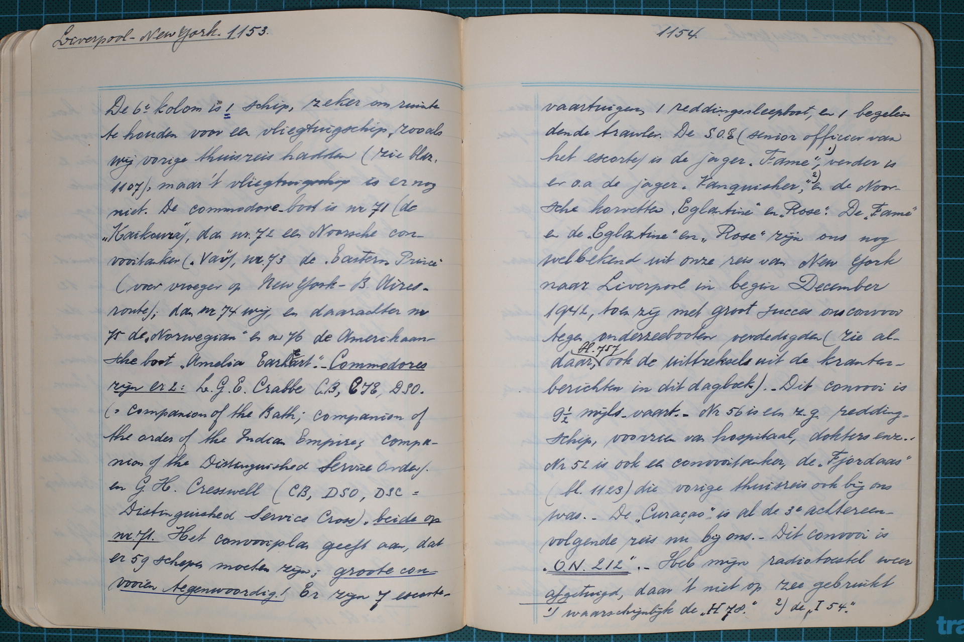 1153 De 6e kolom is 1 schip, zeker om ruimte te houden voor een vliegdekschip, zooals wij vorige thuisreis hadden (zie bldz. 1107), maar ’t vliegtuigschip is er nog niet. De commodore-boot is nr. 71 (de “Kaikoura”), dan nr. 72 een Noorsche convooitanker (“Vav”), nr. 73 de “Eastern Prince” (voer vroeger op New York - B. Aires-route); dan nr. 74 wij, en daarachter de nr. 75 de “Norwegian” en nr. 76 de Amerikaansche boot “Amelia Earheart”.- Commodores zijn er 2: L.G.E. Crabbe CB, CIE, DSO. (= Companion of the Bath; companion of the order of the Indian Empire; companion of the Distinguished Service Order) en G.H. Cresswell (CB, DSO, DSC = Distinguished Service Cross), beide op nr. 71. Het convooiplan geeft aan, dat er 59 schepen moesten zijn; groote convooien tegenwoordig!