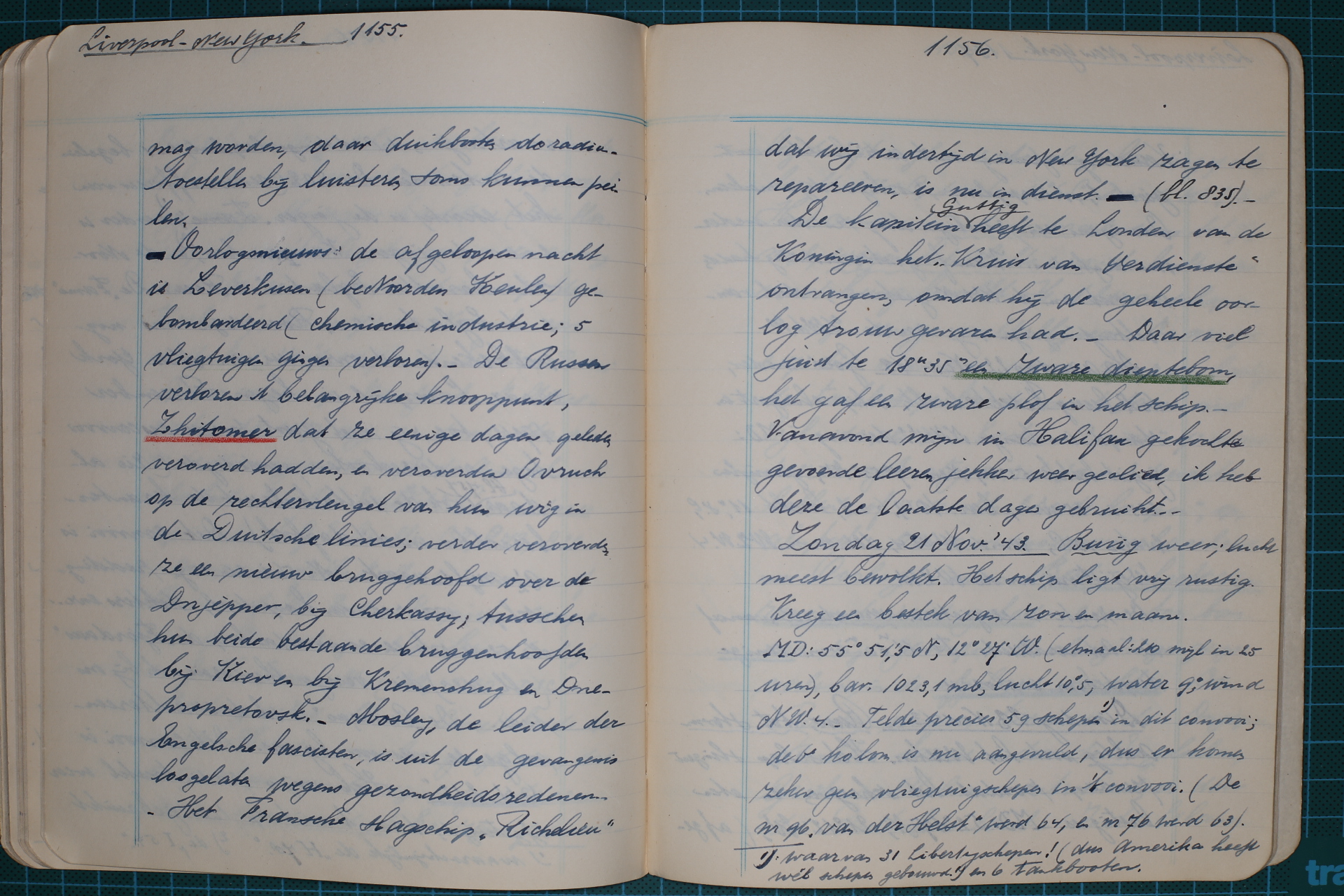 1152 Zaterdag 20 Nov. ’43. De eerste hondewacht, in de Iersche Zee, viel nogal mee. Wij voeren met ± 17 schepen in 2 kolommen, en wij waren ’t achterste schip in de rechtsche kolom. Overdag kwamen de andere schepen, uit Glasgow, Belfast, Milford enz. er bij, en des namiddags vormde het convooi zich op, in 12 kolommen, voorbij Oversay Eiland aan de Schotse kust.