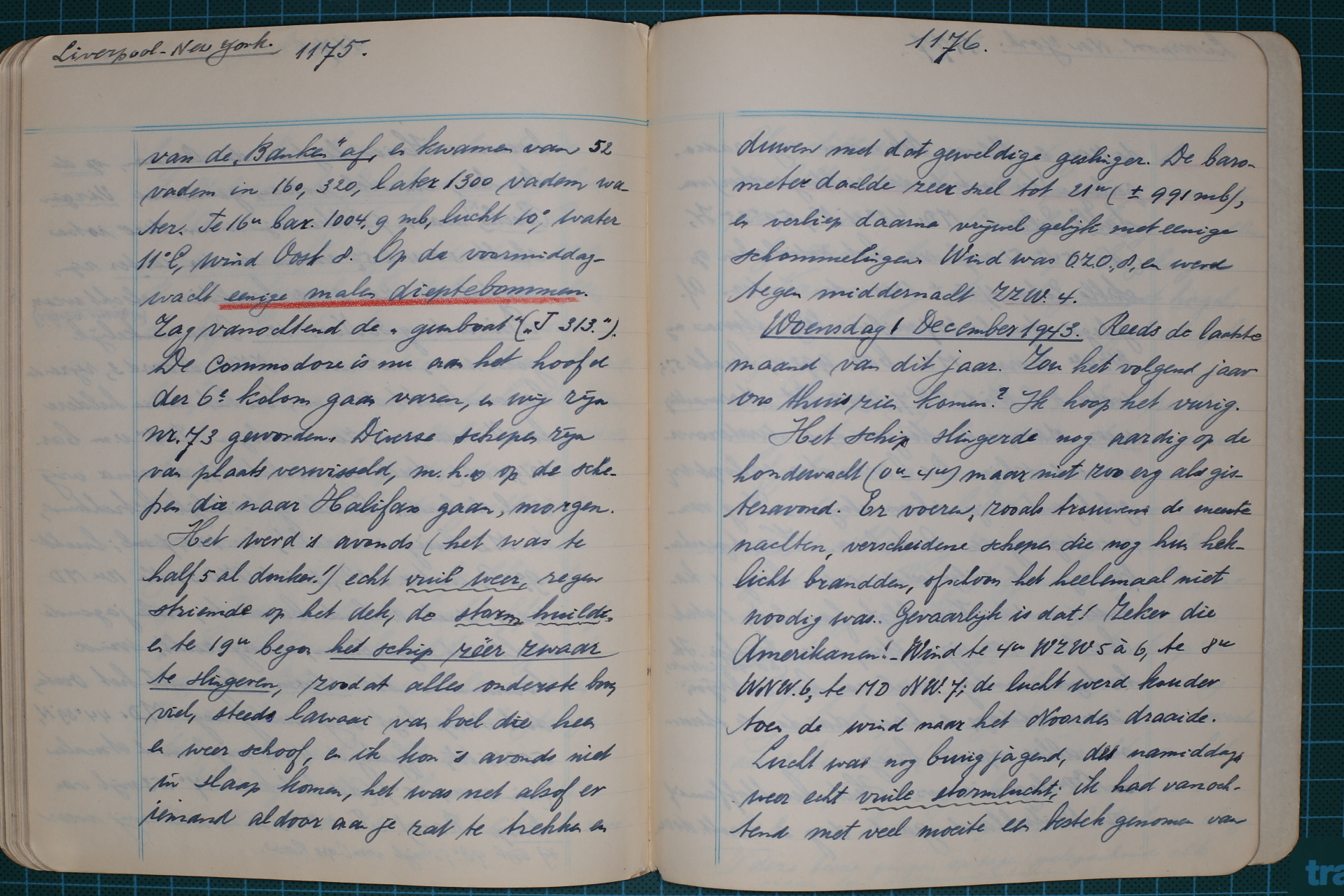 Het werd ’s avonds (het was te half 5 al donker!) echt vuil weer, regen striemde op het dek, de storm huilde, en te 19 uur begon het schip zeer zwaar te slingeren, zoodat alles onderste boven viel, steeds lawaai van boel die heen en weer schoof, en ik kon ’s avonds niet in slaap komen, het was net alsof er iemand aldoor aan je zat te trekken en 1176 duwen met dat geweldige geslinger. De barometer daalde zeer snel tot 21 uur (± 991 mb.), en verliep daarna vrijwel gelijk met eenige schommelingen. Wind was OZO. 8., en werd tegen middernacht ZZW. 4.