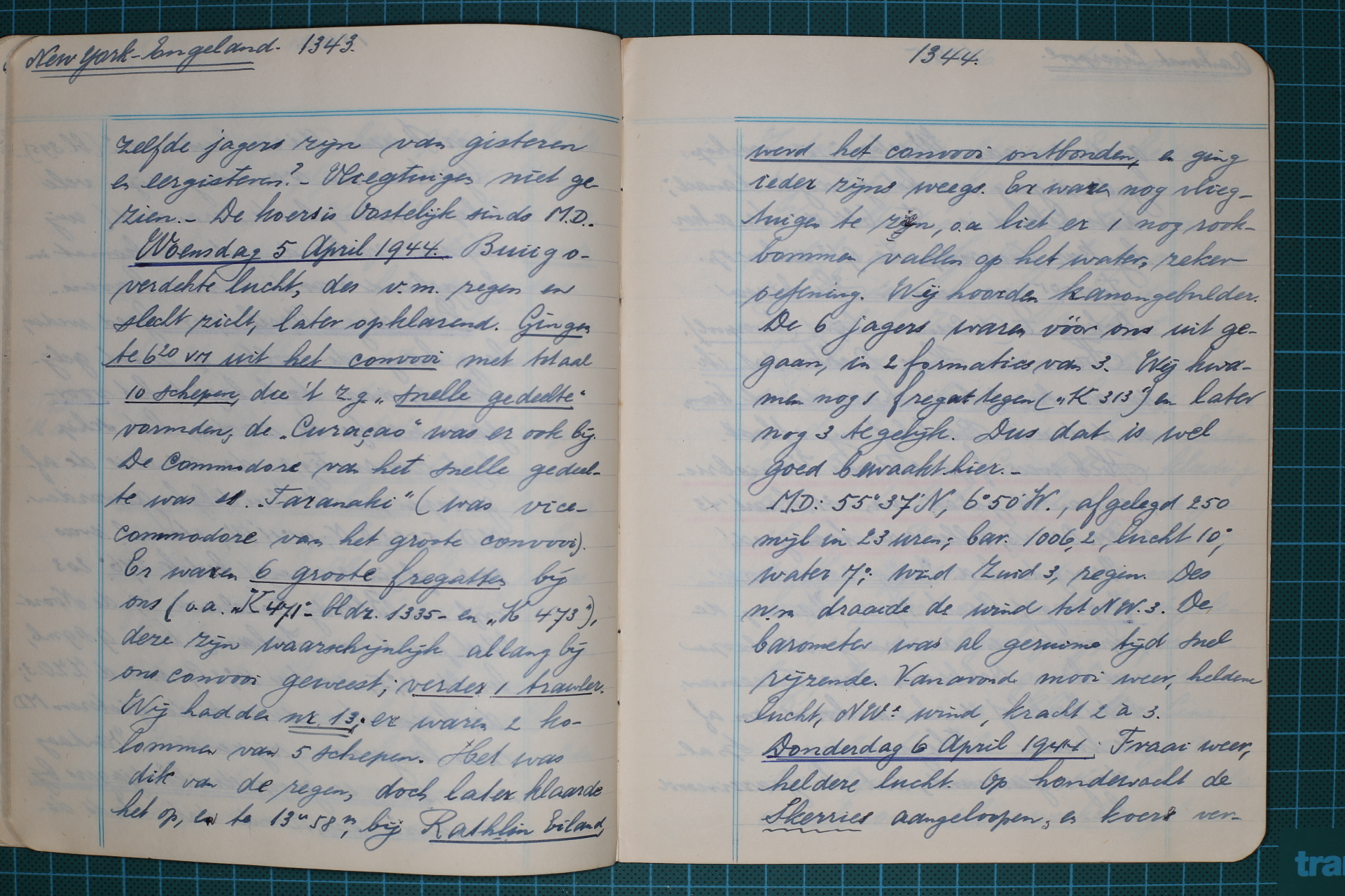 Donderdag 6 April 1944. Fraai weer, heldere lucht. Op de hondewacht de Skerries 1345 aangeloopen, en koers veranderd naar “Western” vuurschip, bij de ingang van het “geveegde kanaal”, dat beboeid is. Te 6.24 uur v.m. ten anker bij Bar Vuurschip. Te 9.13 uur anker op. Te 15.05 uur gemeerd in Huskisson Dok, no. I (de Cunard Lijn). (Liverpool).