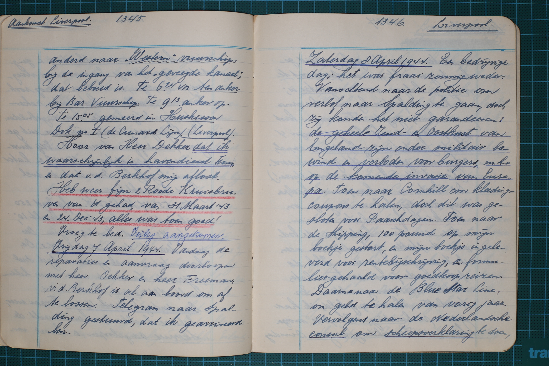 1346 Zaterdag 8 April 1944. Een bedrijvige dag; het was fraai zonnig weder. Vanochtend naar de politie om verlof naar Spalding te gaan, doch zij konden het niet garandeeren: de geheele Zuid- en Oostkust van Engeland zijn onder militair bewind en verboden voor burgers, m.h.o. op de komende invasie van Europa. Toen naar Cornhill om kleedingcoupons te halen, doch dit was gesloten voor Paaschdagen. Toen naar de Shipping, 100 pound op mijn boekje gestort, en mijn boekje ingeleverd voor rentebijschrijving, en formulier gehaald voor goedkoop reizen. Daarna naar de Blue Star Line, om geld te halen van vorig jaar.