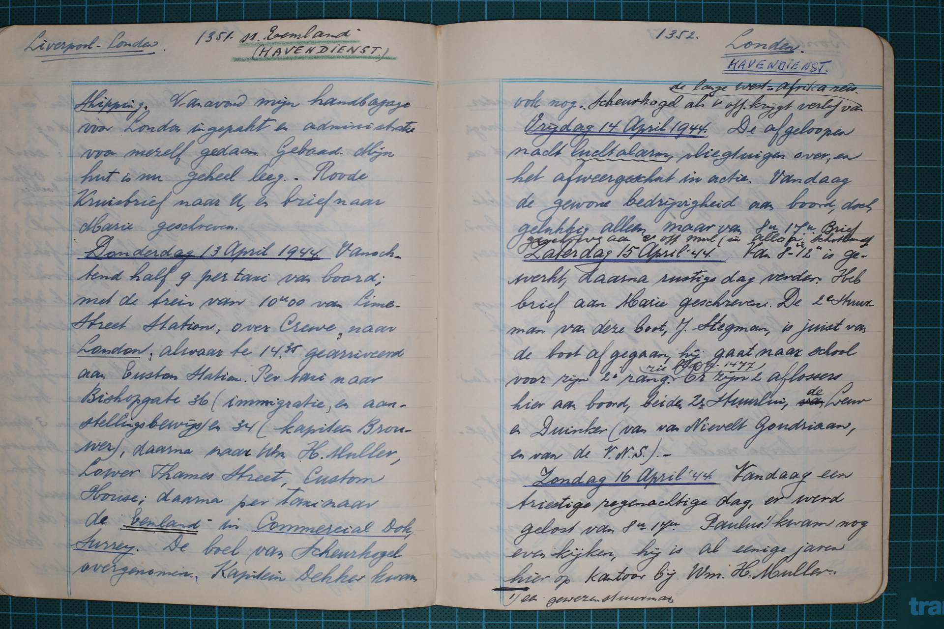 Donderdag 13 april 1944 Vanochtend om half negen van boord en met de taxi naar het station. Met de trein van tien uur via Crewe naar Limestreet Station, London. Om half drie gearriveerd op Euston Station. Per taxi naar de immigratie voor een aanstellingsbewijs en bij kapitein Brouwer langs. Daarna naar Muller, Custom House, waarna per taxi naar de Eemland in het Commercial Dok, Surrey. De boel van eerste officier Scheurkogel overgenomen. Kapitein Dekker kwam ook nog langs. Scheurkogel krijgt verlof van de lange West-Afrika reis.