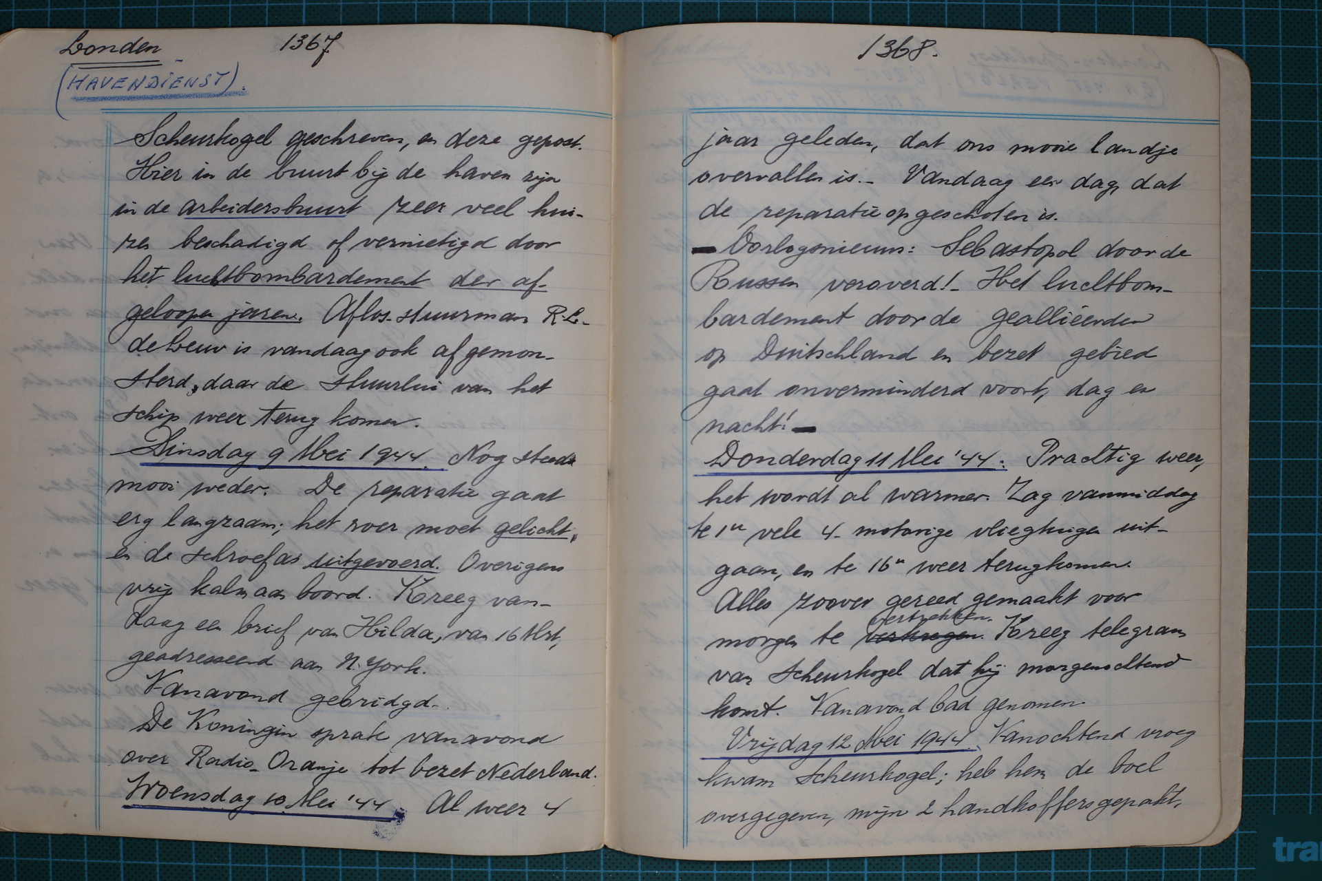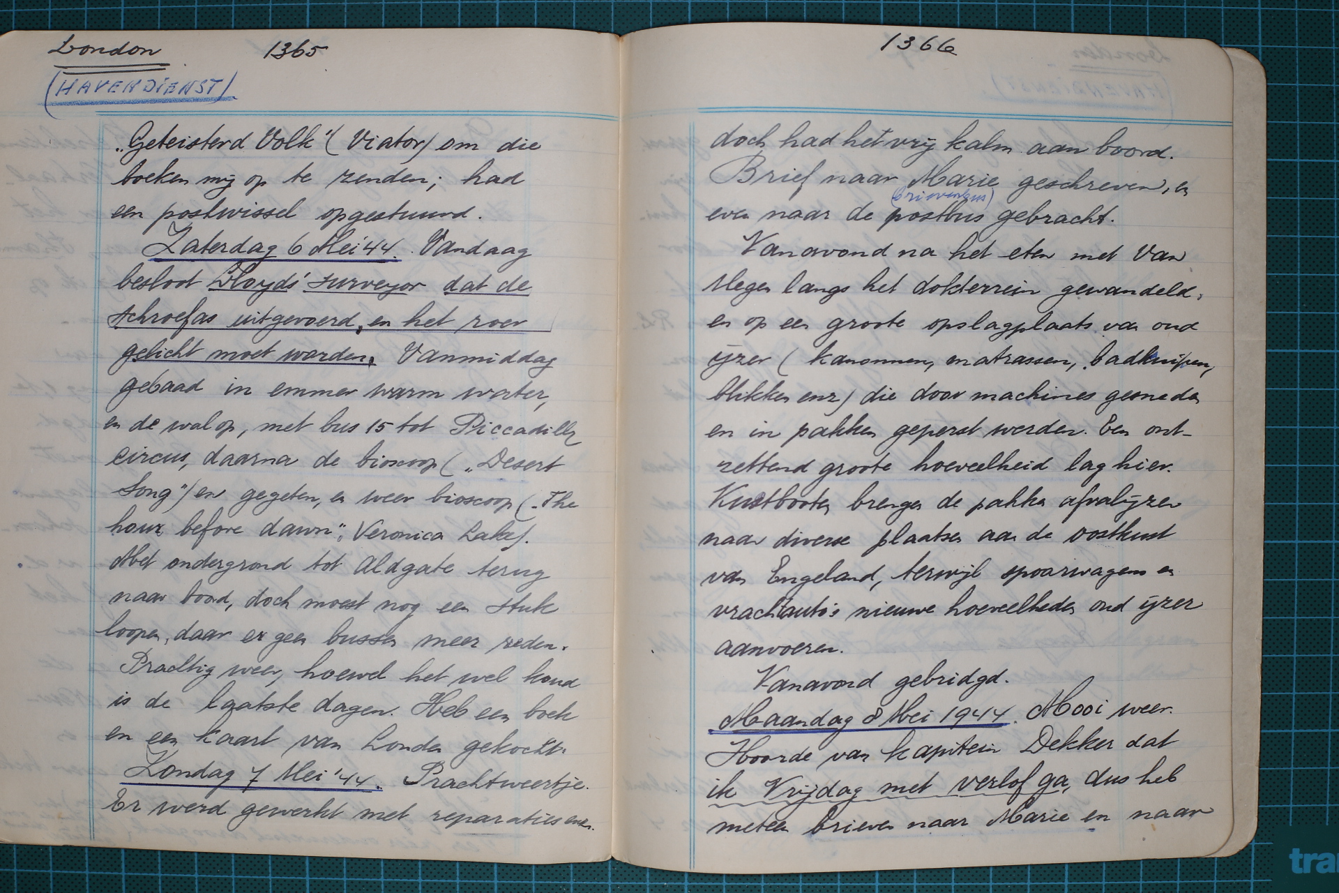 Zondag 7 Mei ’44. Prachtweertje. Er werd gewerkt met reparaties enz. doch had het 1366 vrij kalm aan boord. Brief naar Marie geschreven, en even naar de postbus (brievenbus) gebracht. Vanavond na het eten met Van Megen langs het dokterrein gewandeld, en op een groote opslagplaats van oud ijzer (kanonnen, matrassen, badkuipen, blikken enz.) die door machines gesneden en in pakken geperst werden. Een ontzettend groote hoeveelheid lag hier. Kustbooten brengen de pakken afvalijzer naar diverse plaatsen aan de Oostkust van Engeland, terwijl spoorwagens en vrachtauto’s nieuwe hoeveelheden oud ijzer aanvoeren. Vanavond gebridgd.