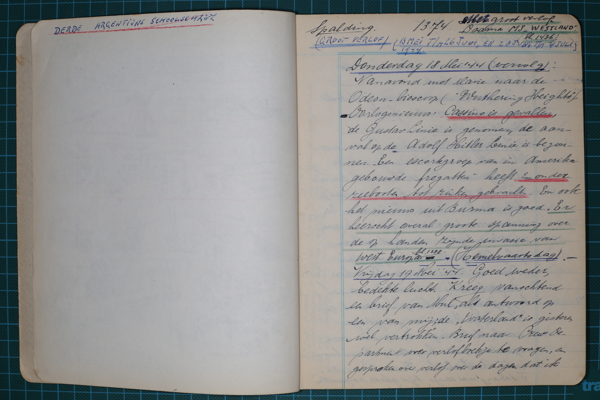 Vrijdag 19 Mei ’44. (Hemelvaartsdag).- Goed weder, bedekte lucht. Kreeg vanochtend een brief van Mul, als antwoord op een van mij; de “Waterland” is gisteren wel vertrokken. Brief naar Crew Department over verlofbriefje te vragen, en 1375 gesproken over verlof over de dagen dat ik onafgebroken te Londen op de “Eemland” afloste.