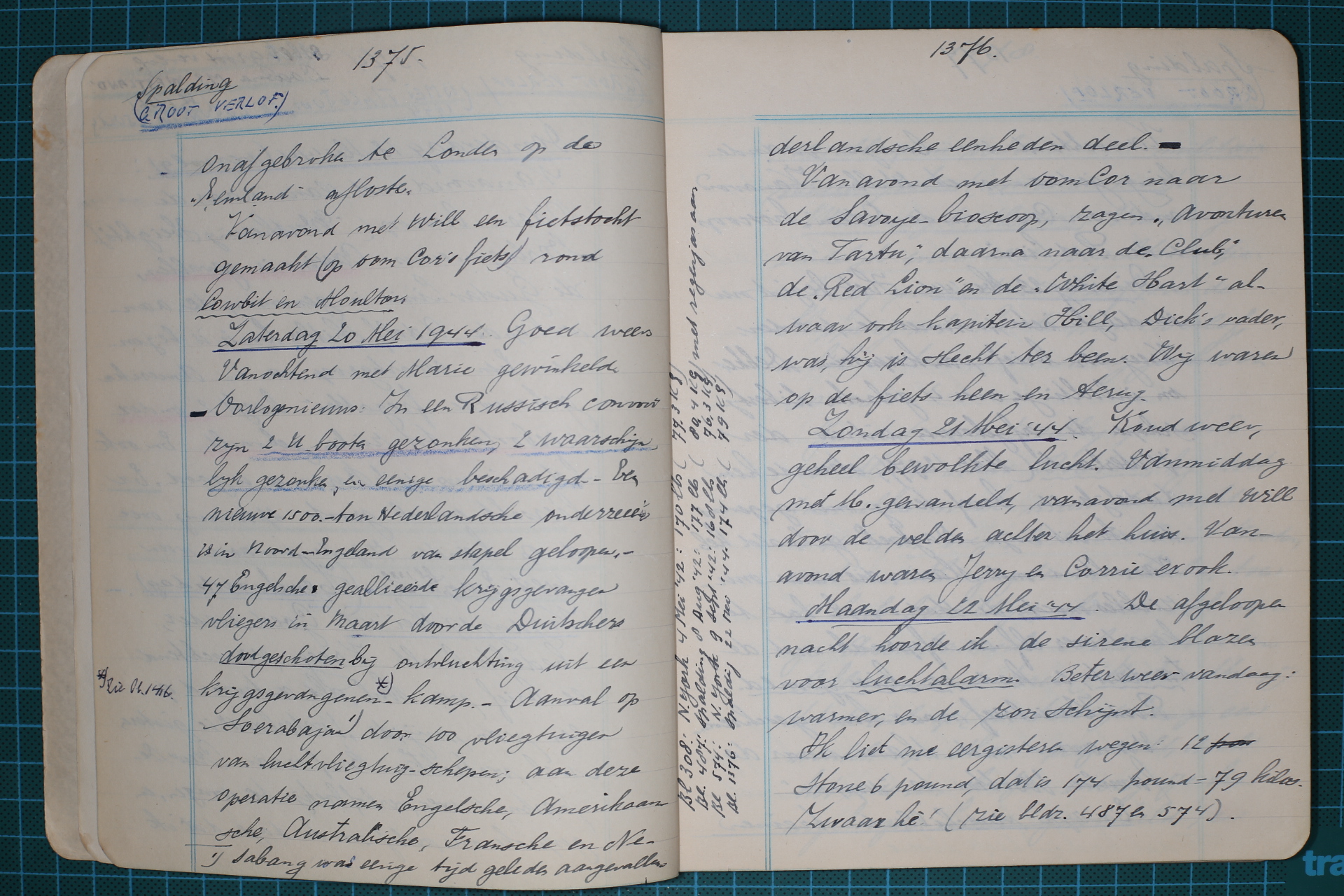 Maandag 22 Mei ’44. De afgeloopen nacht hoorde ik de sirene blazen voor luchtalarm. Beter weer vandaag: warmer, en de zon schijnt. Ik liet me eergisteren wegen: 12 stone 6 pound, dat is 174 pound = 79 kilos. Zwaar hè! 1377 (zie bldz. 487 en 574). Vanochtend een lange wandeling gedaan met Will. Vanavond met oom Cor naar de “Odeon”- bioscoop en de “Red Lion”.