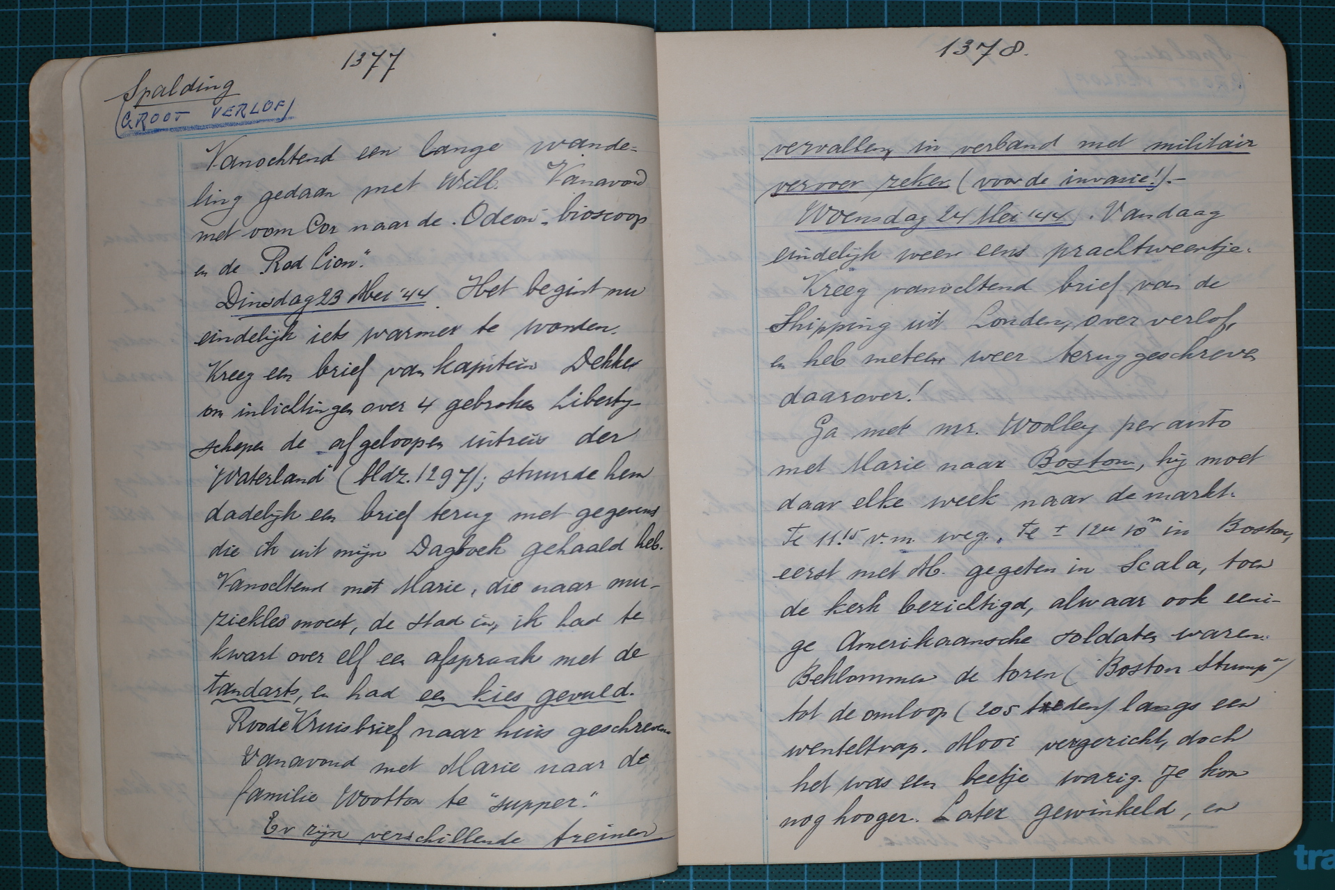 Dinsdag 23 Mei ’44. Het begint nu eindelijk iets warmer te worden. Kreeg een brief van kapitein Dekker om inlichtingen over 4 gebroken Liberty-schepen de afgeloopen uitreis der “Waterland” (bldz. 1297) ; stuurde hem dadelijk een brief terug met gegevens die ik uit mijn Dagboek gehaald heb. Vanochtend met Marie, die naar muziekles moest, de stad in, ik had te kwart over elf een afspraak met de tandarts, en had een kies gevuld. Roode Kruisbrief naar huis geschreven. Vanavond met Marie naar de familie Wootton te “supper”. 1378 Er zijn verschillende treinen vervallen, in verband met de militair vervoer zeker (voor de invasie!).-