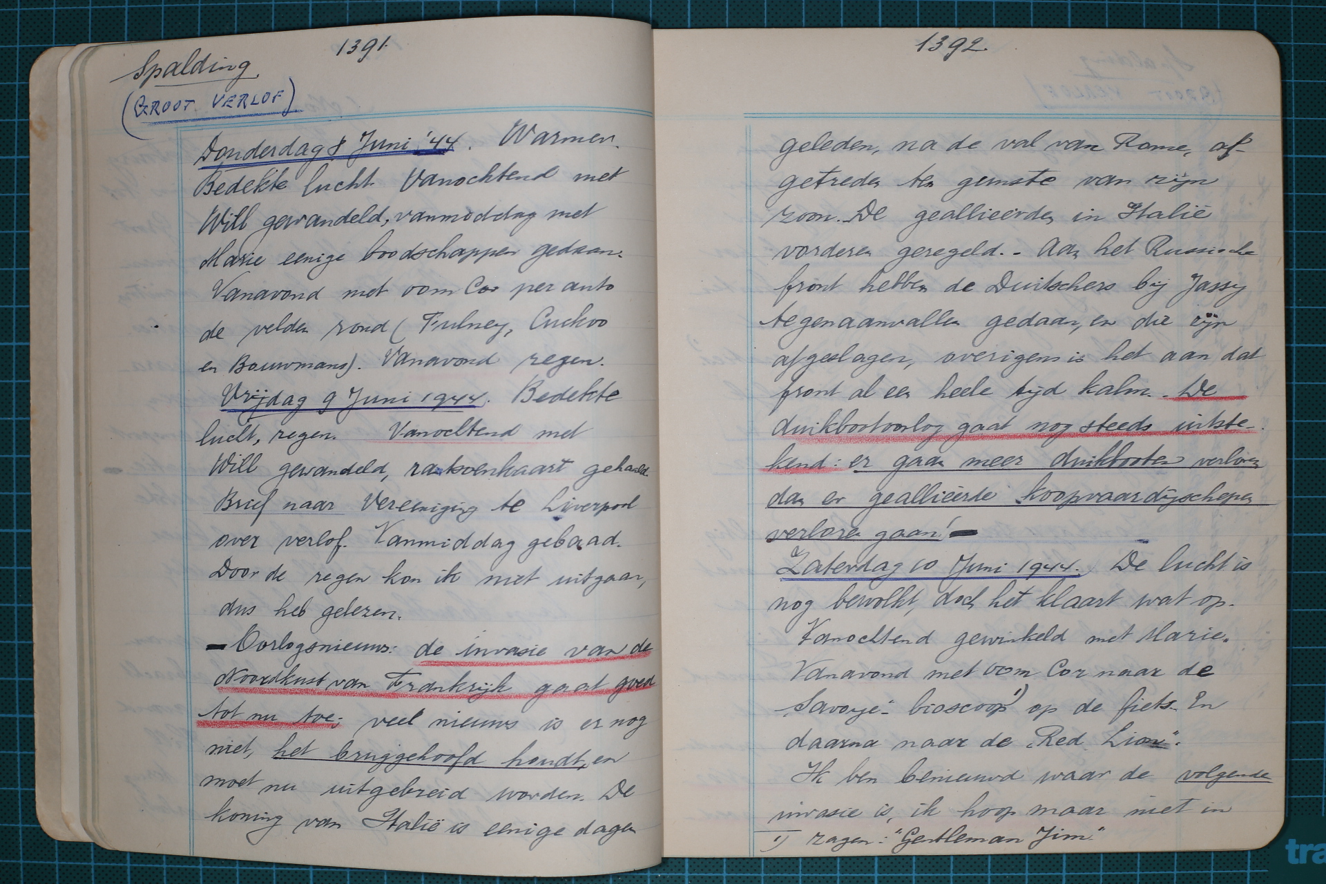 Zaterdag 10 Juni 1944. De lucht is nog bewolkt, doch het klaart wat op. Vanochtend gewinkeld met Marie. Vanavond met oom Cor naar de “Savoye”-bioscoop [1] op de fiets. En daarna naar de “Red Lion”. Ik ben benieuwd waar de volgende invasie is, ik 1393 hoop maar niet in ons landje: alle visserschepen aan de Westkust van Noorwegen, Denemarken, Holland, België en Frankrijk zijn deze week per radio gewaarschuwd niet buitengaats te gaan in verband met de komende militaire operaties. [2] Is U niet blij dat het eindelijk zoo ver is? Iedereen hier is opgelucht dat de invasie er eindelijk is!