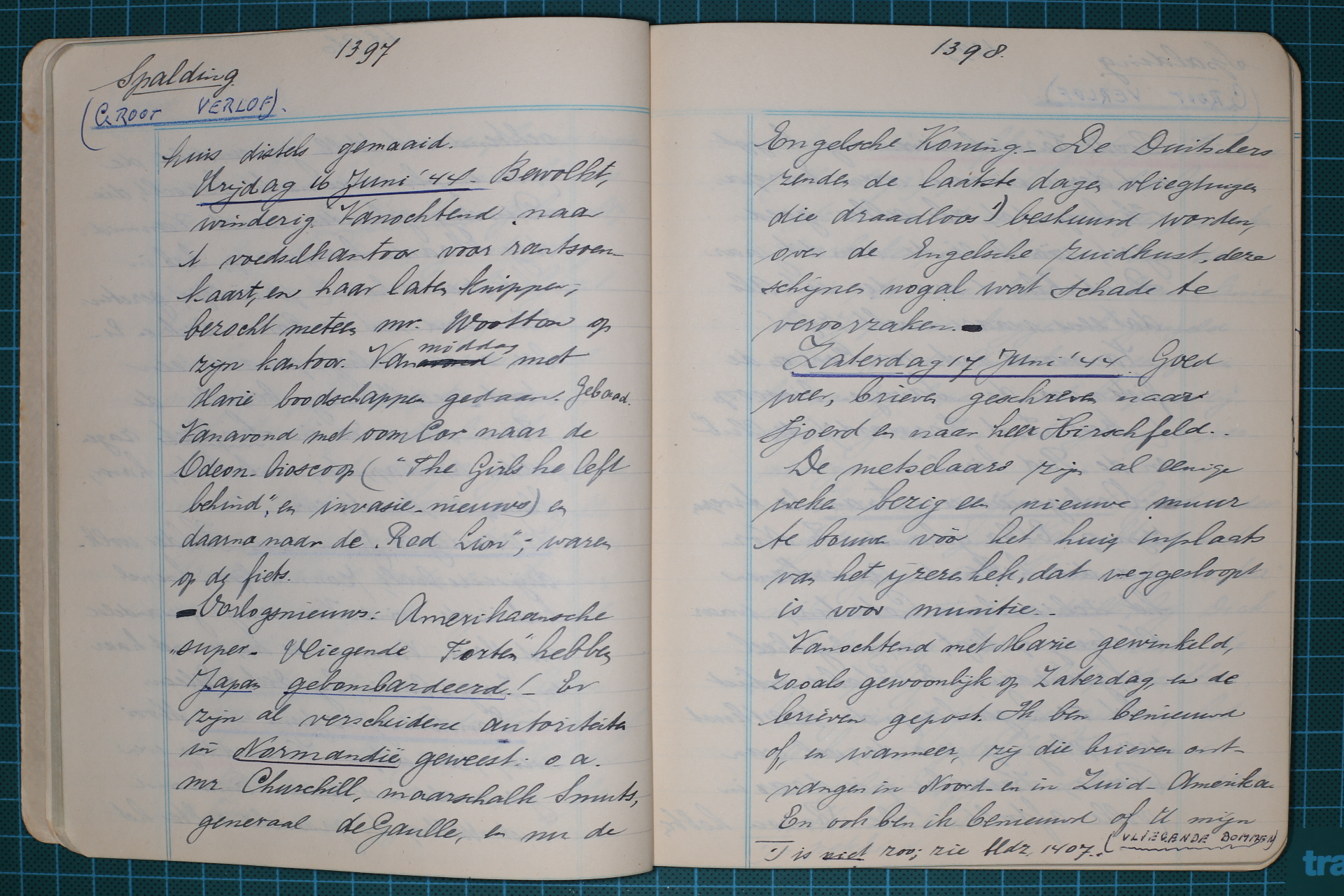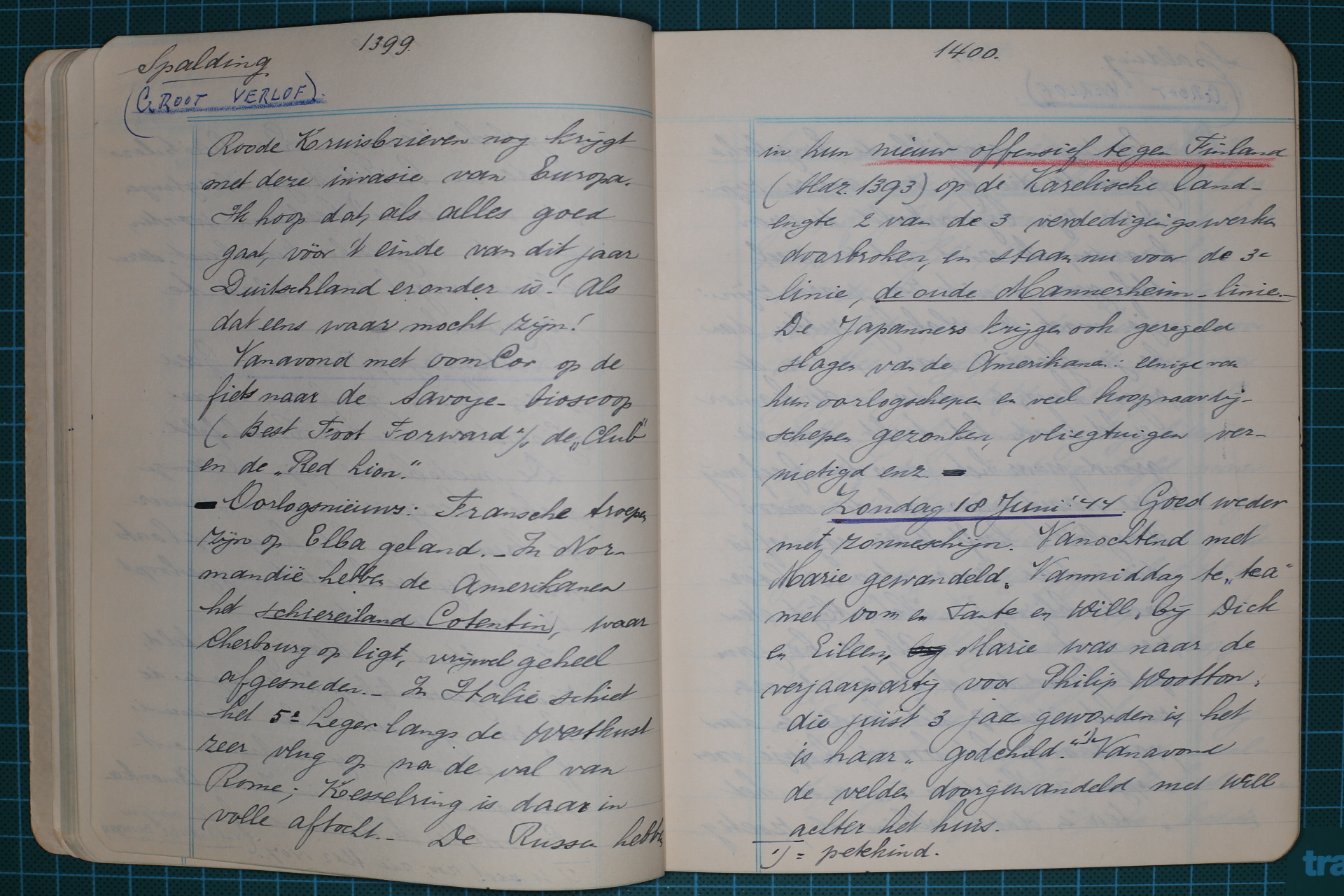 Vanochtend met Marie gewinkeld, zoals de gewoonte is op zaterdag, en de brieven gepost. Ik ben benieuwd of, en wanneer, ze die brieven in Noord- en in Zuid-Amerika ontvangen. En ik ben ook benieuwd of u mijn Rode Kruisbrieven nog krijgt, nu met de invasie van Europa. Ik hoop dat, als alles goed gaat, Duitsland er voor het einde van dit jaar onder is. Als dat eens waar mocht zijn.