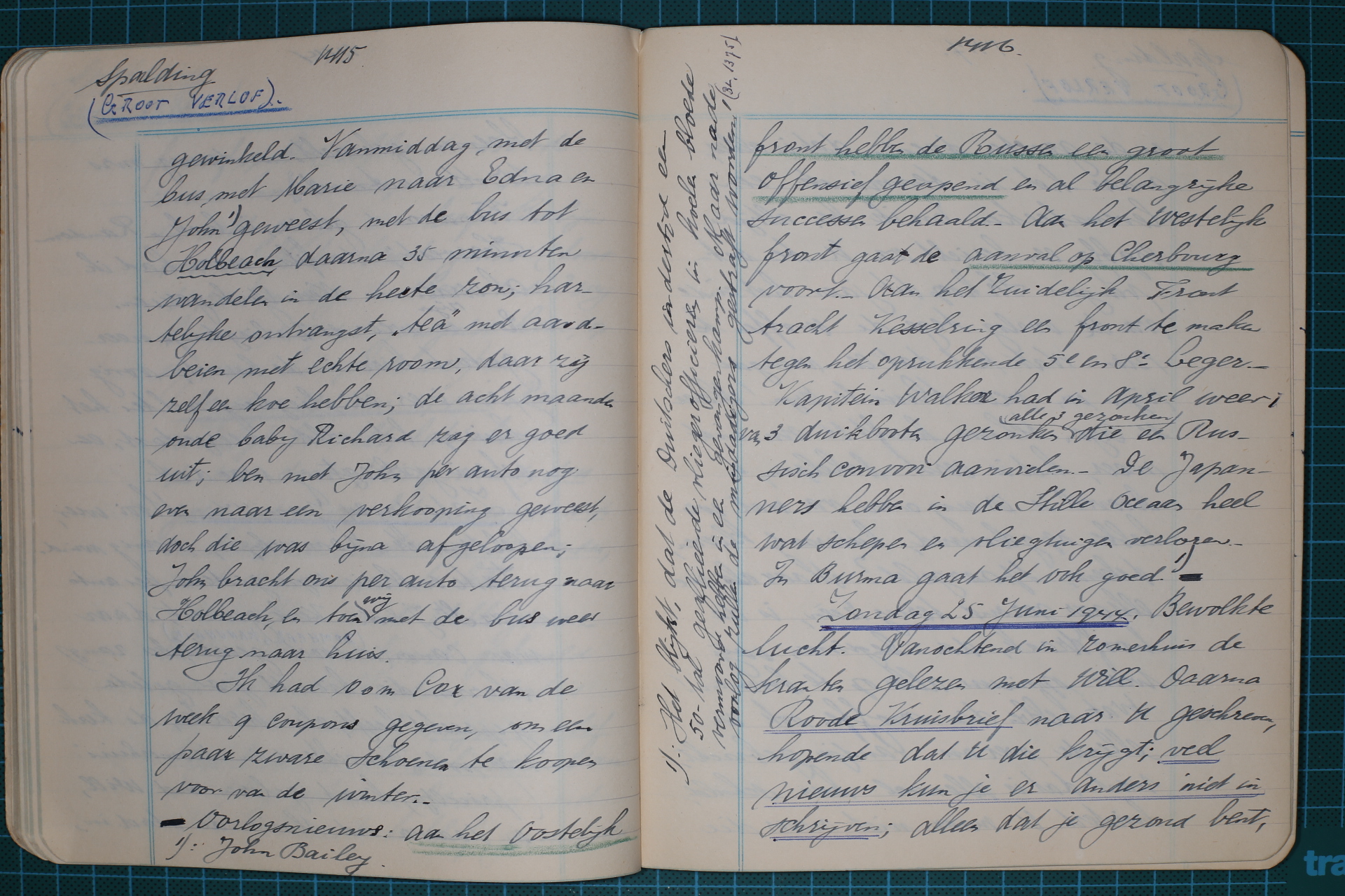 Zaterdag 24 Juni ’44. Mooi weer, helder met zonneschijn, weinig wind. Tante en Marie zijn gisteren per auto naar St. John’s Kerk geweest, daar was Canon (= soort geestelijke rang, domheer, kanunnik) Morris die hier 18 jaar geleden gepreekt heeft, als bezoeker, de kerk was vol.