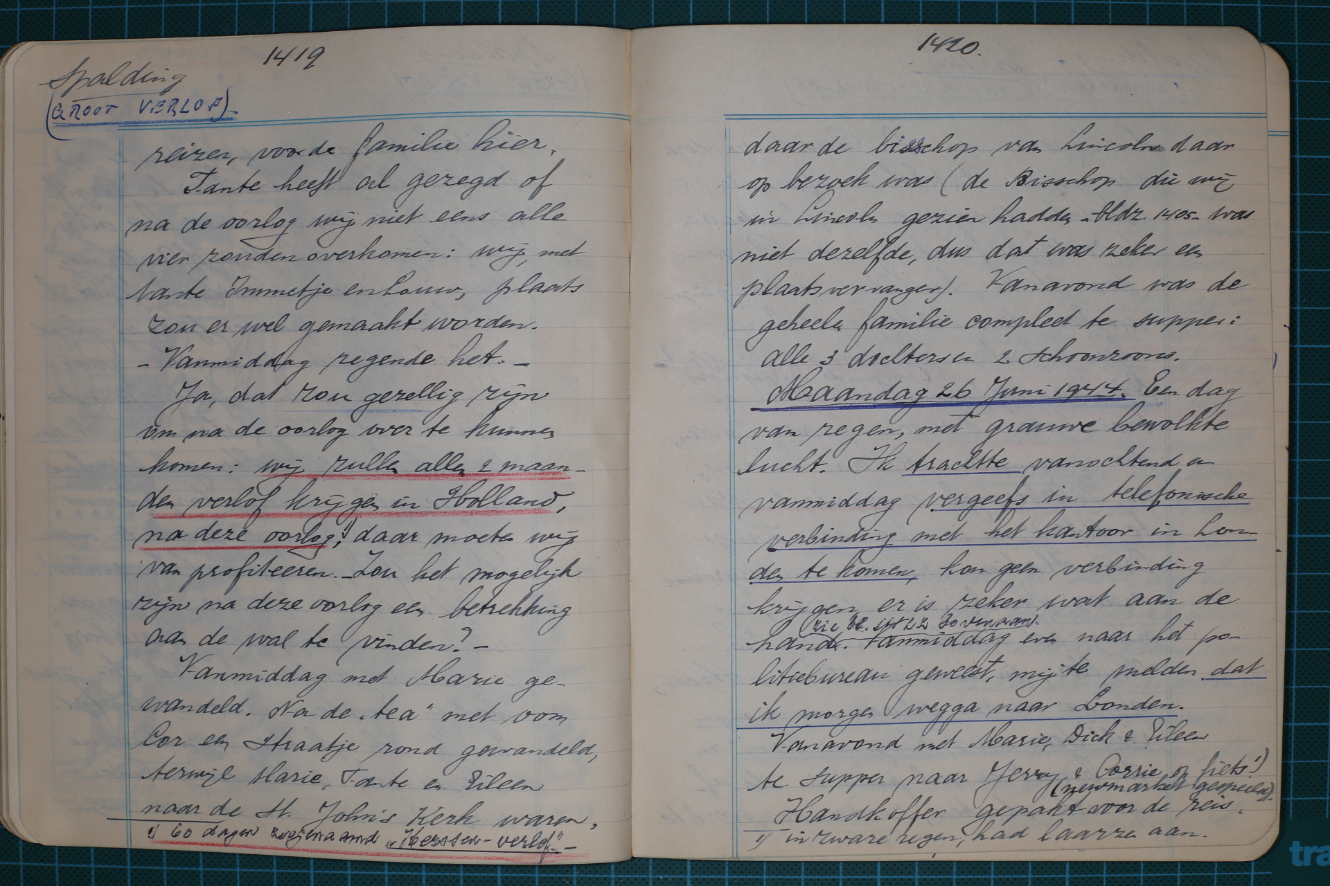 Maandag 26 Juni 1944. Een dag van regen, met grauwe bewolkte lucht. Ik trachtte vanochtend en vanmiddag vergeefs in telefonische verbinding met het kantoor in Londen te komen, kon geen verbinding krijgen, er is zeker wat aan de hand (zie bl.1422 bovenaan). Vanmiddag even naar het politiebureau geweest, mij te melden, dat ik morgen wegga naar Londen. Vanavond met Marie, Dick & Eileen te supper naar Jerry & Corrie op fiets. [1] (Newmarket gespeeld). Handkoffer gepakt voor de reis.