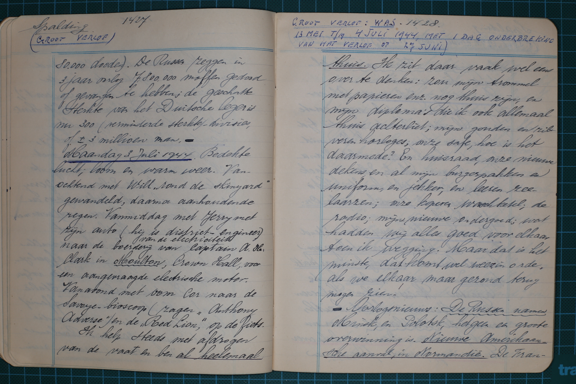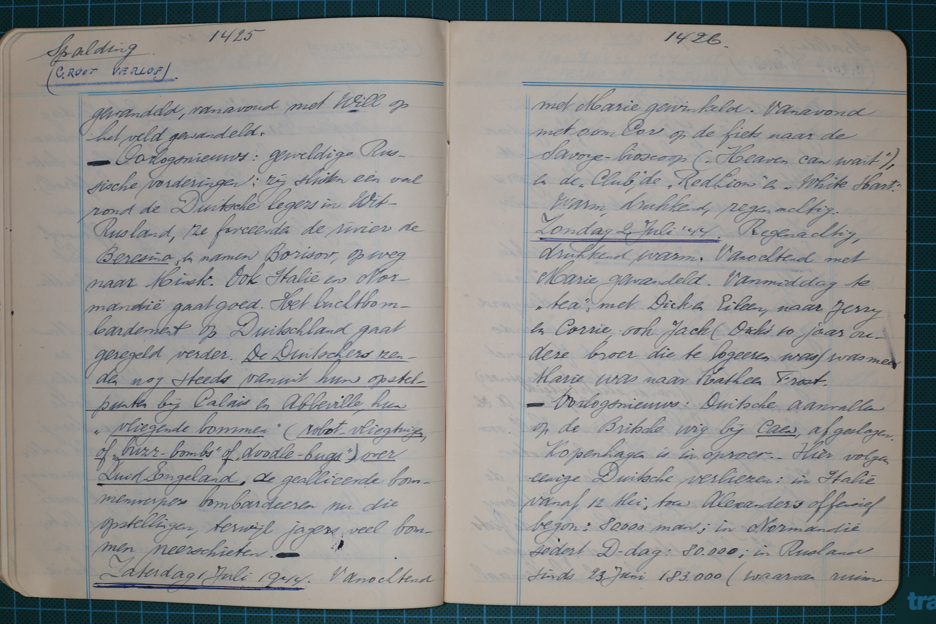 --- Oorlogsnieuws: geweldige Russische vorderingen: zij sluiten een val rond de Duitsche legers in Wit-Rusland, ze forceerden de rivier de Beresina, en namen Borisov, op weg naar Minsk. Ook Italië en Normandië gaat goed. Het luchtbombardement op Duitschland gaat geregeld verder. De Duitschers zenden nog steeds vanuit hun opstelpunten bij Calais en Abbeville, hun “vliegende bommen” (robot-vliegtuigen, of “buzz-bombs” of “doodle-bugs”) over Zuid-Engeland, de gealliëerde bommenwerpers bombardeeren nu die opstellingen, terwijl jagers veel bommen neerschieten. ---