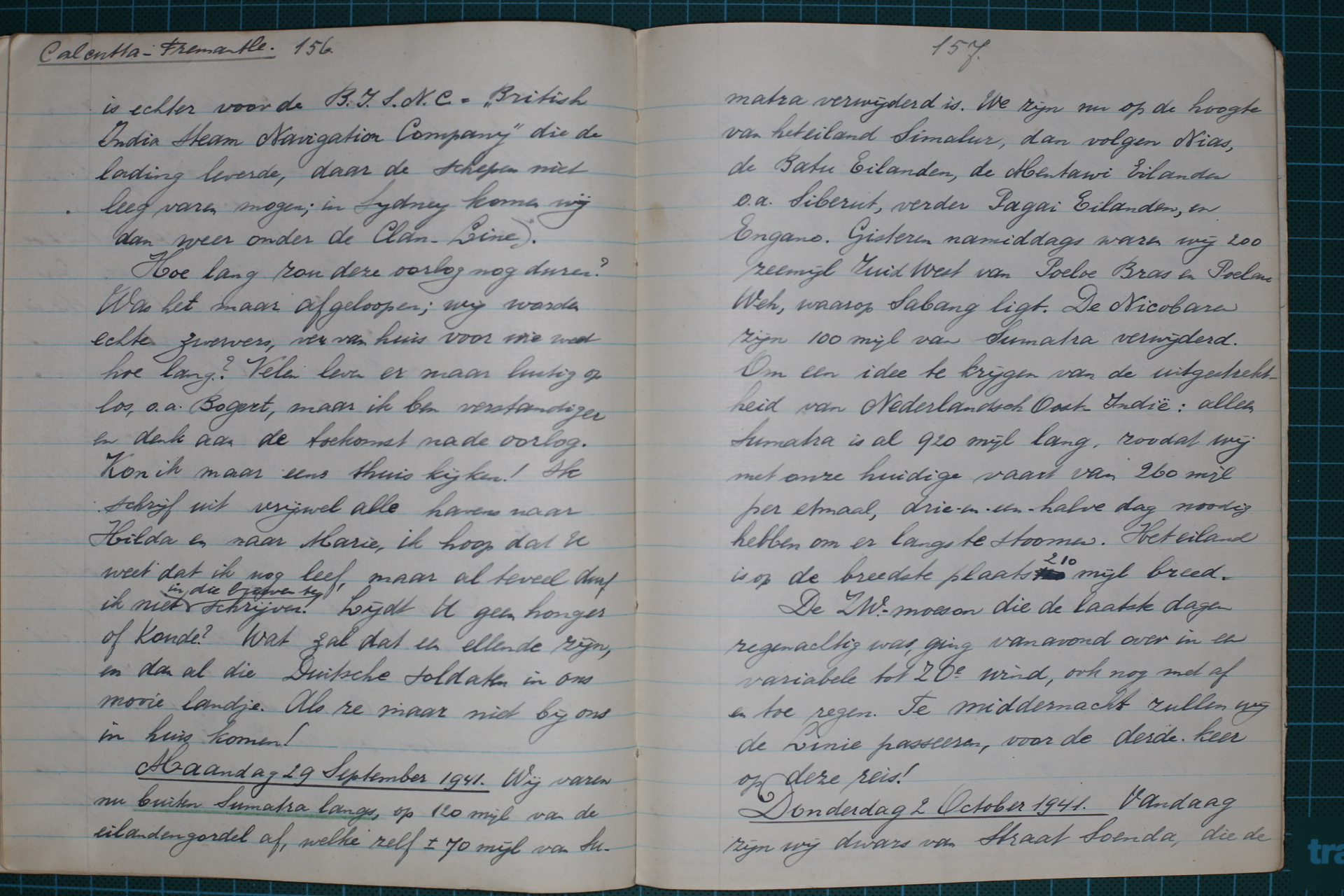 Maandag 29 September 1941. Wij varen nu buiten Sumatra langs, op 120 mijl van de 157 eilandengordel af, welke zelf ± 70 mijl van Sumatra verwijderd is. We zijn nu op de hoogte van het eiland Simalur, dan volgen Nias, de Batu Eilanden, de Mentawi Eilanden o.a. Siberut, verder Pagai Eilanden, en Engano. Gisteren namiddags waren wij 200 zeemijl Zuid West van Poeloe Brasp en Poelau Weh, waarop Sabang ligt. De Nicobarenn zijn 100 mijl van Sumatra verwijderd. Om een idee te krijgen van de uitgestrektheid van Nederlandsch Oost-Indië: alleen Sumatra is al 920 mijl lang, zoodat wij met onze huidige vaart van 260 mijl per etmaal, drie-en-een-halve dag nodig hebben om er langs de stoomen. Het eiland is op de breedste plaats 210 mijl breed. De ZW.-moeson die de laatste dagen regenachtig was, ging vanavond over in een variabele tot ZOe wind, ook nog met af en toe regen. De middernacht zullen wij de Linie passeren, voor de derde keer op deze reis!