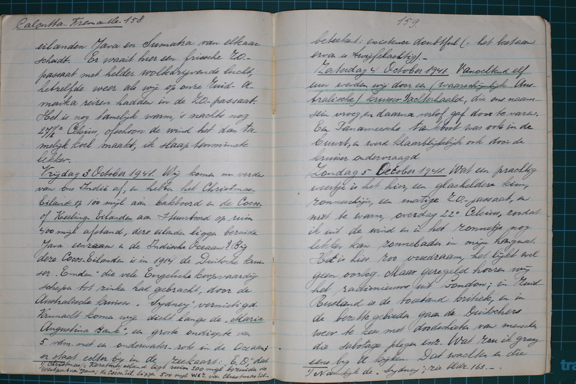Vrijdag 3 October 1941. Wij komen nu verder van ons Indië af, en hebben het Christmas Eiland op 100 mijl aan bakboord en de Cocos- of de Keeling-Eilanden aan stuurboord op ruim 400 mijl afstand, deze eilanden liggen bezuiden Java eenzaam in de Indische Oceaan. [1] Bij deze Cocos-eilanden is in 1914 de Duitsche kruiser “Emden” die vele Engelsche koopvaardijschepen tot zinken had gebracht, door de Australische kruiser “Sydney” vernietigd. Vannacht komen wij dicht langs de “Maria Augustina Bank”, een groote ondiepte van 5 vdm. met een onder waterrots in de 159 Oceaan; er staat echter bij in de zeekaart: “E.D”. Dat beteekent: existence doubtful (= het bestaan ervan is twijfelachtig).-