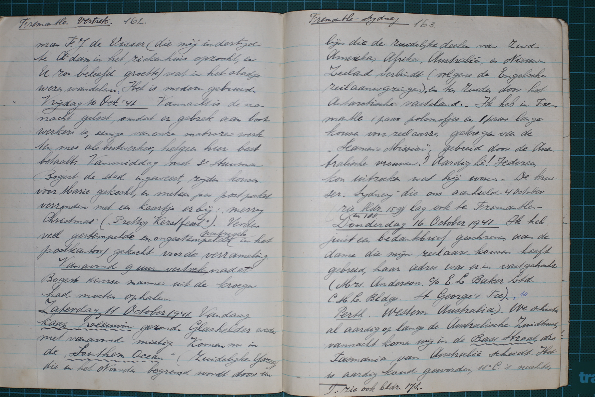 Donderdag 16 October 1941. Ik heb juist een bedankbrief geschreven aan de dame die mijn zeelaars-kousen heeft gebreid, haar adres was er aan vastgehecht.(Mrs. Anderson. c/o E.L. Baker Ltd. C.M.L.Bldgs. St. George’s Tce.). te Perth. Western Australia). We schieten al aardig op langs de Australische Zuidkust, vannacht komen wij in de Bass Straat, die Tasmania van Australië scheidt. Het is aardig koud 164 geworden, 11° C. ’s nachts, waaraan wij niet meer gewend zijn, omdat we steeds in de warmte gevaren hebben. Er loopt steeds een lange ZWe deining, er is weinig stroom, NOe tot Ze winden; we zien veel albatrossen, groote witte vogels met zeer breede vlucht.