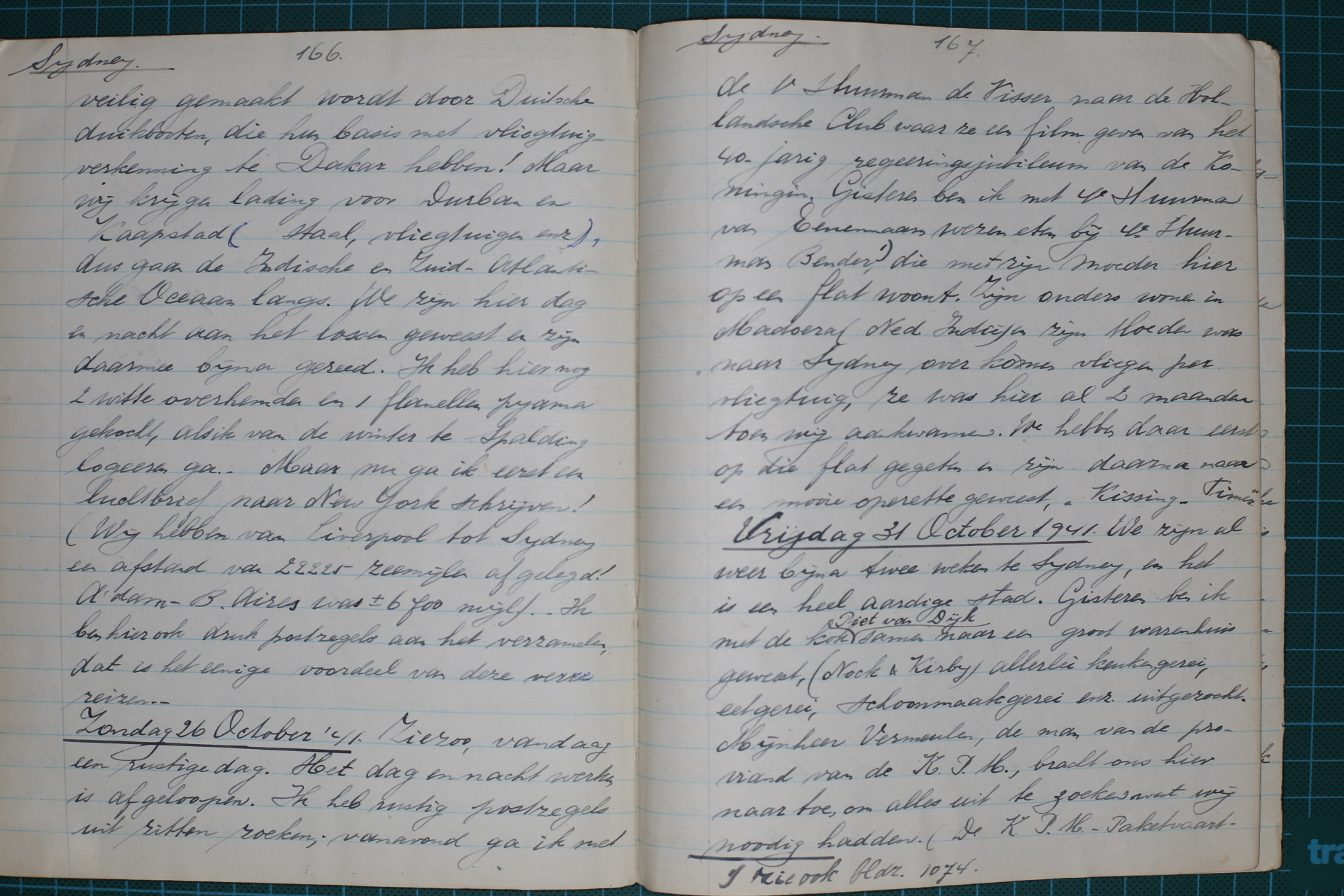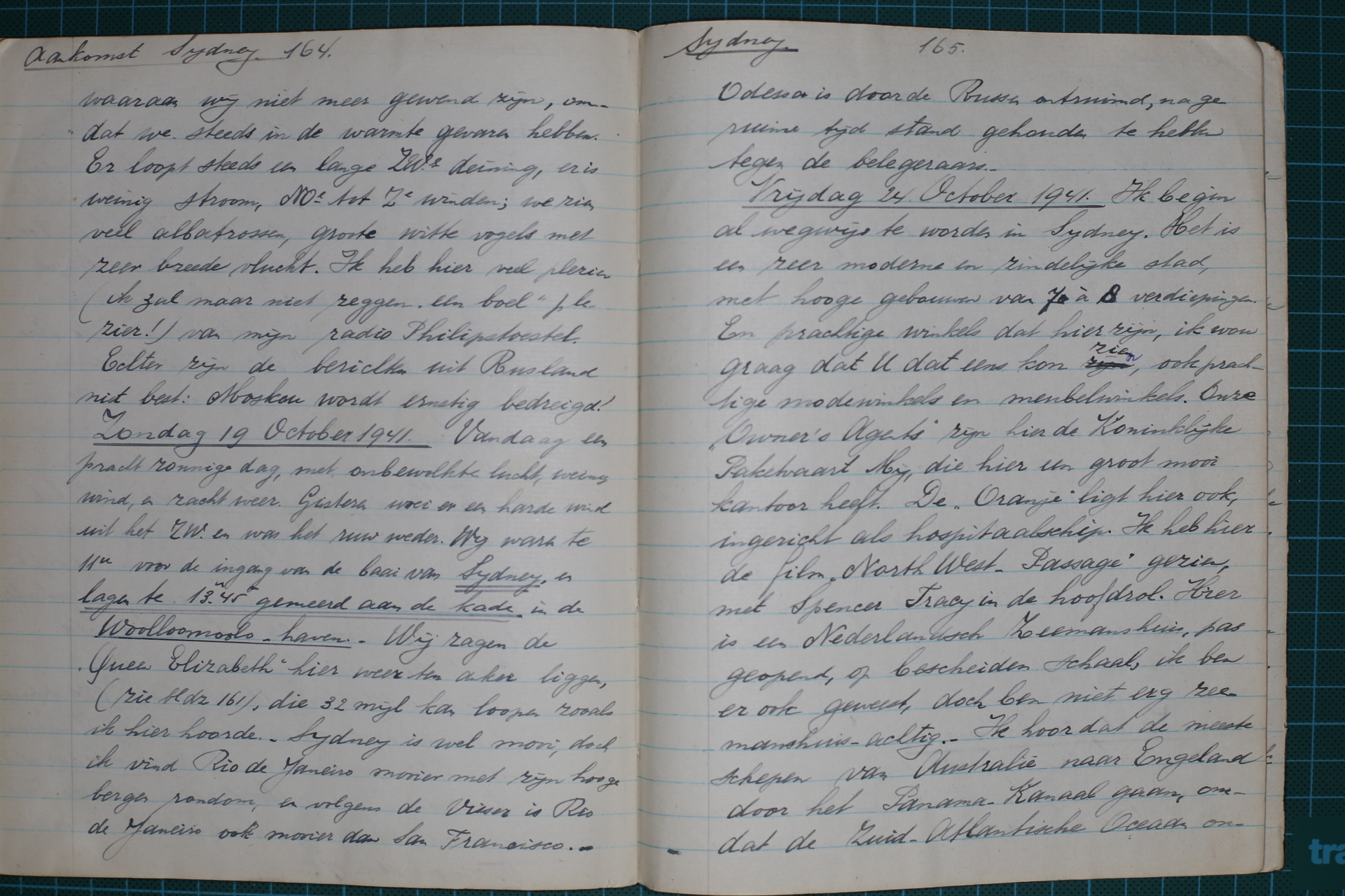 Zondag 26 oktober 1941 Ziezo, vandaag een rustige dag. Het dag en nacht werken is afgelopen. Ik heb rustig postzegels uit zitten zoeken en vanavond ga ik met eerste stuurman De Visser naar de Hollandse Club waar ze een film vertonen van het veertigjarig regeringsjubileum van de koningin. Gisteren ben ik met vierde stuurman Van Eenenmaan wezen eten bij vierde stuurman Bender die met zijn moeder hier op een flat woont. Zijn ouders wonen in Madoera op Nederlands-Indië en zijn moeder was naar Sydney over komen vliegen. Ze was hier al twee maanden. We hebben daar eerst op die flat gegeten en zijn daarna naar een mooie operette geweest, Kissing Times.