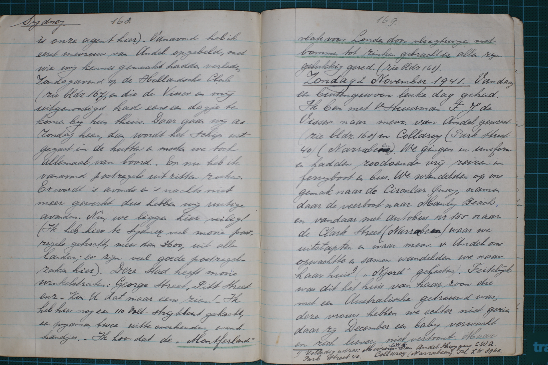 Zondag 26 October '41. Ziezoo, vandaag een rustige dag. Het dag en nacht werken is afgeloopen. Ik heb rustig postzegels uit zitten zoeken; vanavond ga ik met de 1e 167 stuurman de Visser naar de Hollandsche Club waar ze een film geven van het 40-jarig regeeringsjubileum van de Koningin. Gisteren ben ik met 4e stuurman van Eenenmaan wezen eten bij 4e stuurman Bender, [1] die met zijn moeder hier op een flat woont. Zijn ouders wonen in Madoera (Ned. Indië) en zijn Moeder was naar Sydney over komen vliegen per vliegtuig, ze was hier al 2 maanden toen wij aankwamen. We hebben daar eerst op die flat gegeten en zijn daarna naar een mooie operette geweest, “Kissing-Times”.