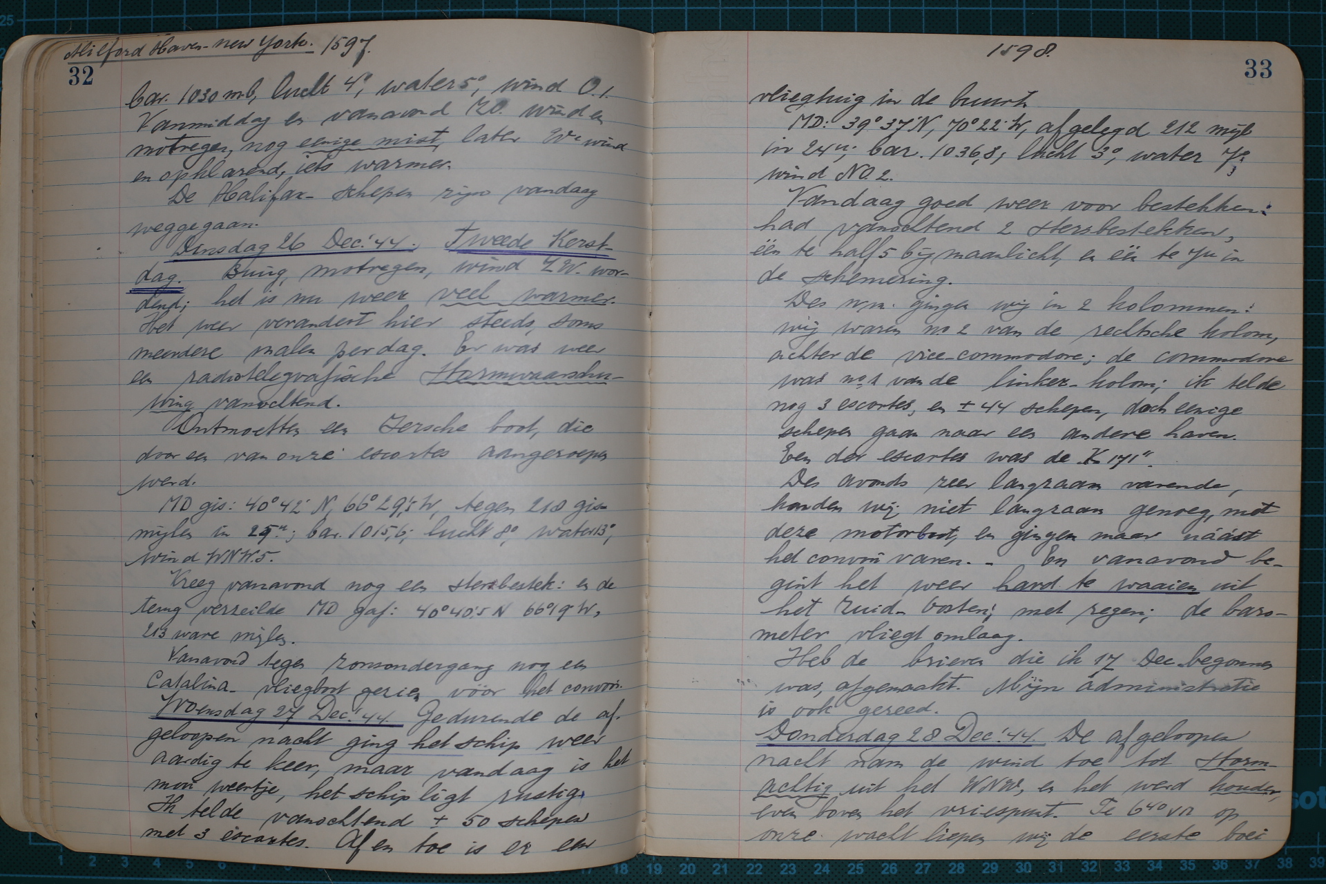 Vrijdag 29 Dec. ’44. Ballast begonnen te lossen. Vanmiddag met kapitein v.d. Berkhof en 1e machinist van der Goes scheepsverklaring gedaan bij Nederlandsche Consul. Meteen wat warm ondergoed, pyama’s en gekleurde halssjaal gekocht. Vanavond rustig bij mijn radio. Brief van Marie ontvangen, en Kerstkaart van Hilda en Sjoerd en Margie.