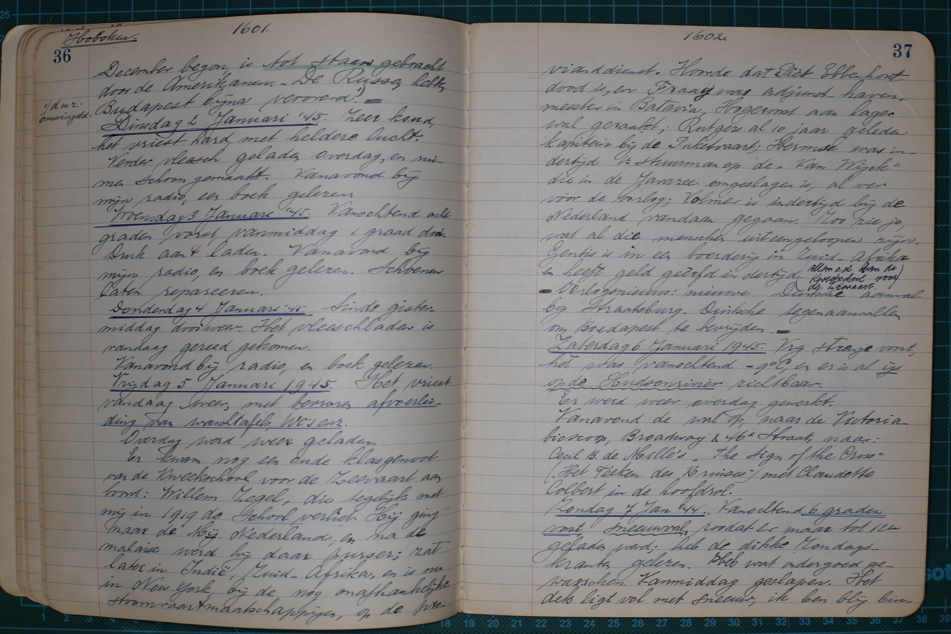 Maandag 8 januari 1945Lichte vorst en 's middags dooi. Overdag werd er geladen. Vanavond bij mijn radio gezeten. Een brief van Hilda ontvangen.