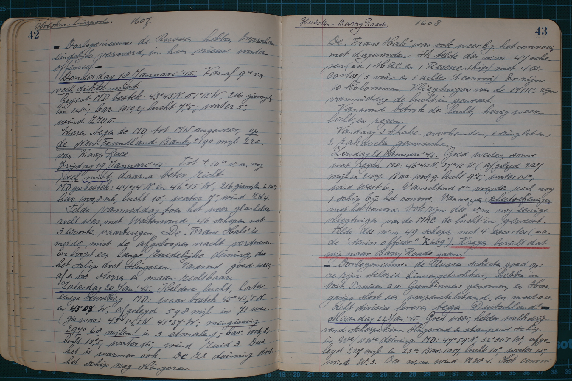 Donderdag 18 Januari ’45. Vanaf 9 uur v.m. veel dikke mist. Gegist MD. bestek: 43° 43’ N. 51° 12’ W., 216 gismijlen in 24 uur; bar. 1010,2; lucht 7,5°; water 5°; wind ZZO. 5. Waren tegen de MD., tot MN. ongeveer, op de New-Foundlandsche Bank, ± 190 mijl ZZO. van Kaap Race.