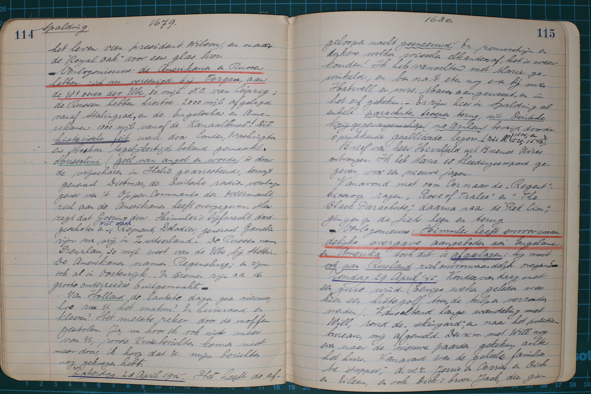 --- Oorlogsnieuws: de Amerikanen en de Russen hebben zich nu vereenigd bij Torgau, aan de We oever der Elbe, 30 mijl NO. van Leipzig; de Russen hebben hiertoe 2000 mijl afgelegd vanaf Stalingrad, en de Engelschen en Amerikanen 1000 mijl vanaf de Kanaalkust! Dit historische feit werd door Londen, Washington en Moskou tegelijkertijd bekend gemaakt. Mussolini (geel van angst en woede) is door de vrijscharen in Italië gearresteerd, terwijl generaal Dietmar, de Duitsche radio-verslaggever van ’t Opper-Commando der Weermacht, zich aan de Amerikanen heeft overgegeven. Men zegt dat Goering door Himmler’s lijfwacht doodgeschoten is.- (niet waar) Reynaud, Daladier, generaal Gamelin zijn nu vrij, in Zwitserland.- De Russen namen Prenzlau, 30 mijl west van de Elbe, bij Stettin. De Amerikanen namen Regensburg; en zijn ook al in Oostenrijk.- In Bremen zijn o.a. 16 groote onderzeeërs buitgemaakt. ---