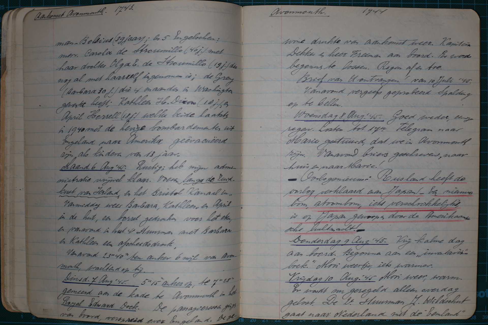 Vrijdag 10 augustus 1945 Mooi weer, warm. Er wordt nu alleen overdag gelost. De tweede stuurman Wildschut gaat volgende week naar Nederland met de Eemland. Ik heb met kapitein Groenewold, die met verlof was, getelefoneerd bij onze agent Charles Hill & Sons. Groenewold komt morgen, zaterdag, naar boord en dus ga ik zondagochtend naar Spalding. Een brief naar huis geschreven.