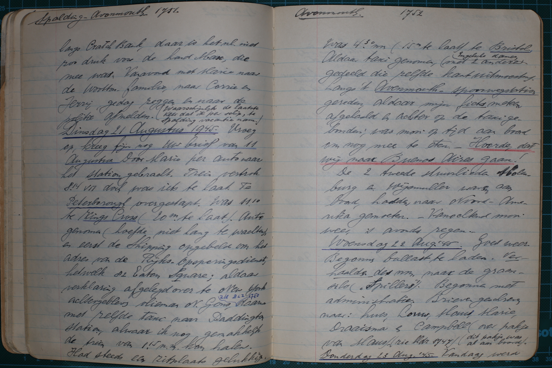 Dinsdag 21 Augustus 1945. Vroeg op, kreeg fijn nog Uw brief van 11 Augustus. Door Marie per auto naar het station gebracht. Trein vertrok 8.14 v.m. doch was iets te laat. Te Peterborough overgestapt. Was 11.10 te Kings Cross (20 m. te laat). Auto genomen (hoefde niet lang te wachten), en eerst de Shipping opgebeld om het adres van de Rijks-Opsporingsdienst, hetwelk te 82 Eaton Square; aldaar verklaring afgelegd over te New York achtergebleven olieman N. Gons (zie bl. 1750), daarna met zelfde taxi naar Paddington Station, alwaar ik nog gemakkelijk de trein van 1.15 1752 n.m. kon halen. Had steeds een zitplaats gelukkig. Was 4.30 n.m. (15 m. te laat) te Bristol. Aldaar taxi genomen, (met 2 anderen, Engelsche dames, gedeeld die zelfde kant op moesten). Langs ’t Avonmouth-spoorwegstation gereden, aldaar mijn fiets meteen afgehaald en achter op de taxi gebonden; was mooi op tijd aan boord om nog mee te eten.- Hoorde dat wij naar Buenos Aires gaan!