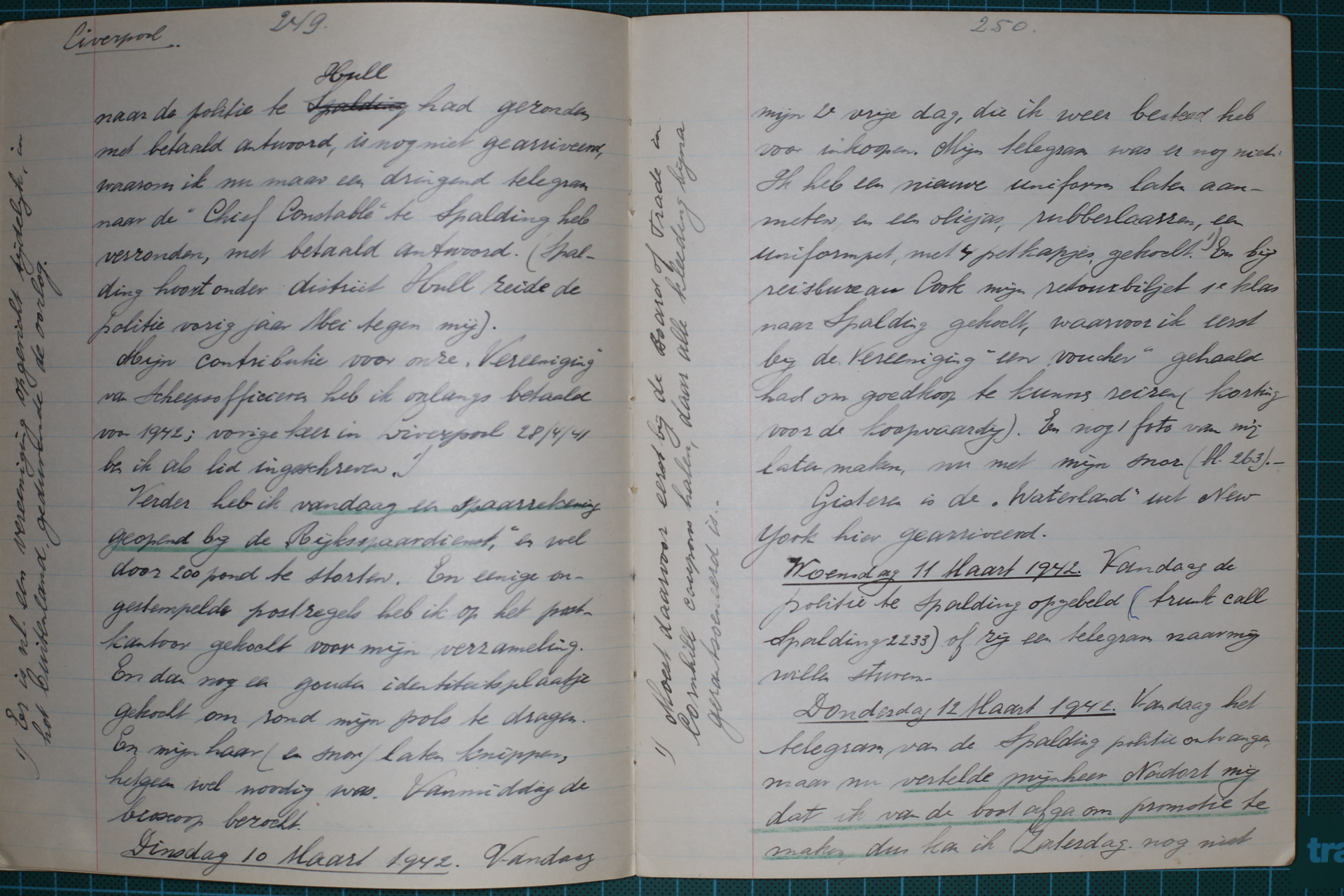 Woensdag 11 Maart 1942. Vandaag de politie te Spalding opgebeld (trunk call Spalding 2233) of zij telegram naar mij willen sturen.