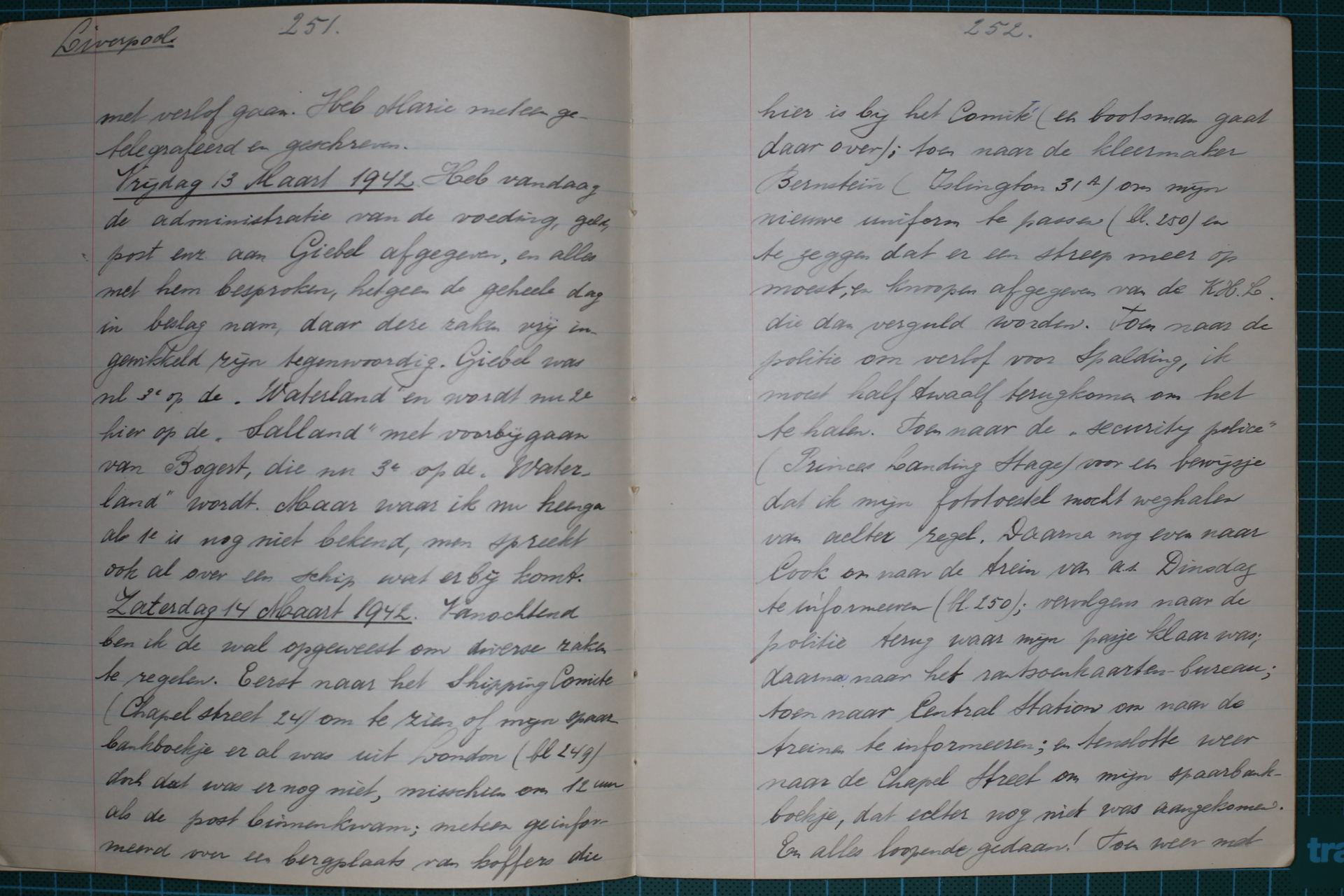 Zaterdag 14 Maart 1942. Vanochtend ben ik de wal opgeweest om diverse zaken te regelen. Eerst naar het Shipping Comite (Chapel street 24) om te zien of mijn spaarbankboekje er al was uit London (bl. 249) Doch dat was er nog niet, misschien om 12 uur als de post binnenkwam; meteen geinformeerd over een bergplaats van 252 koffers die hier is bij het Comité (een bootsman gaat daar over); toen naar de kleermaker Bernstein (Islington 31A) om mijn nieuwe uniform te passen (bl. 250) en te zeggen dat er een streep meer op moest, en knoopen afgegeven van de K.H.L. die dan verguld worden. Toen naar de politie om verlof voor Spalding, ik moest half twaalf terugkomen om het te halen. Toen naar de “security police” (Princes Landing Stage) voor een bewijsje dat ik mijn fototoestel mocht weghalen van achter zegel. Daarna nog even naar Cook om naar de trein van a.s. Dinsdag te informeeren (bl. 250); vervolgens naar de politie terug waar mijn pasje klaar was; daarna naar het rantsoenkaarten-bureau; toen naar Central Station om naar de treinen te informeeren; en tenslotte weer naar de Chapel Street om mijn spaarbankboekje, dat echter nog niet was aangekomen. En alles loopende gedaan! Toen weer met “Overhead” spoorweg 253 terug naar boord; ik zag op het perron bij Pierhead nog de Hollandsche luitenant-ter-zee Roos, die mij aan zijn Engelsche vrouw voorstelde; hij was pas getrouwd; hij gaat over de bewapening van onze schepen.